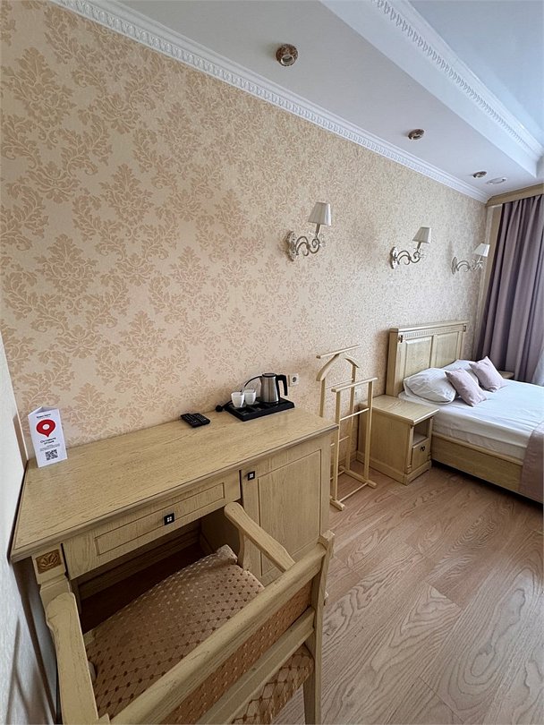 2 односпальные кровати ,2 прикроватные тумбочки , шкаф, журнальный столик?,2 пуфика, вешалка напольная, стул, вешалка +чемоданница, зеркало, часы, плазменный ТВ, кондиционер, телефон, Wi Fi в номере. Современная сантехника,душ. кабина ,мебель для ванной ,фен, набор личных принадлежностей , махровые полотенца, халат, тапочкиУслуги и удобства