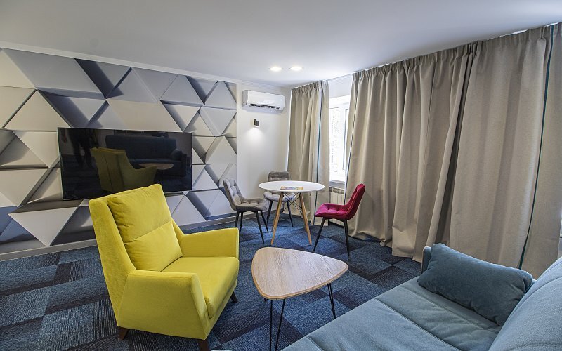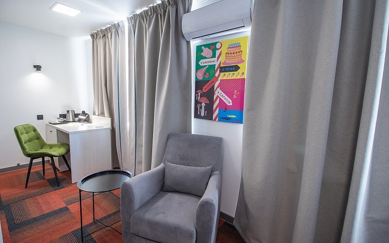 Интерьер номеров 5 этажа продуман до мелочей и выполнен в стиле 60-х годов ХХ века. В каждом номере есть ванная комната или душевая кабина, тёплый пол, кондиционер, новые ортопедические матрасы и яркий дизайн с авторскими постерами. В номерах эконом-класса, расположенных на 3 и 4 этажах гостиницы интерьер номеров выполнен в простом стиле.
