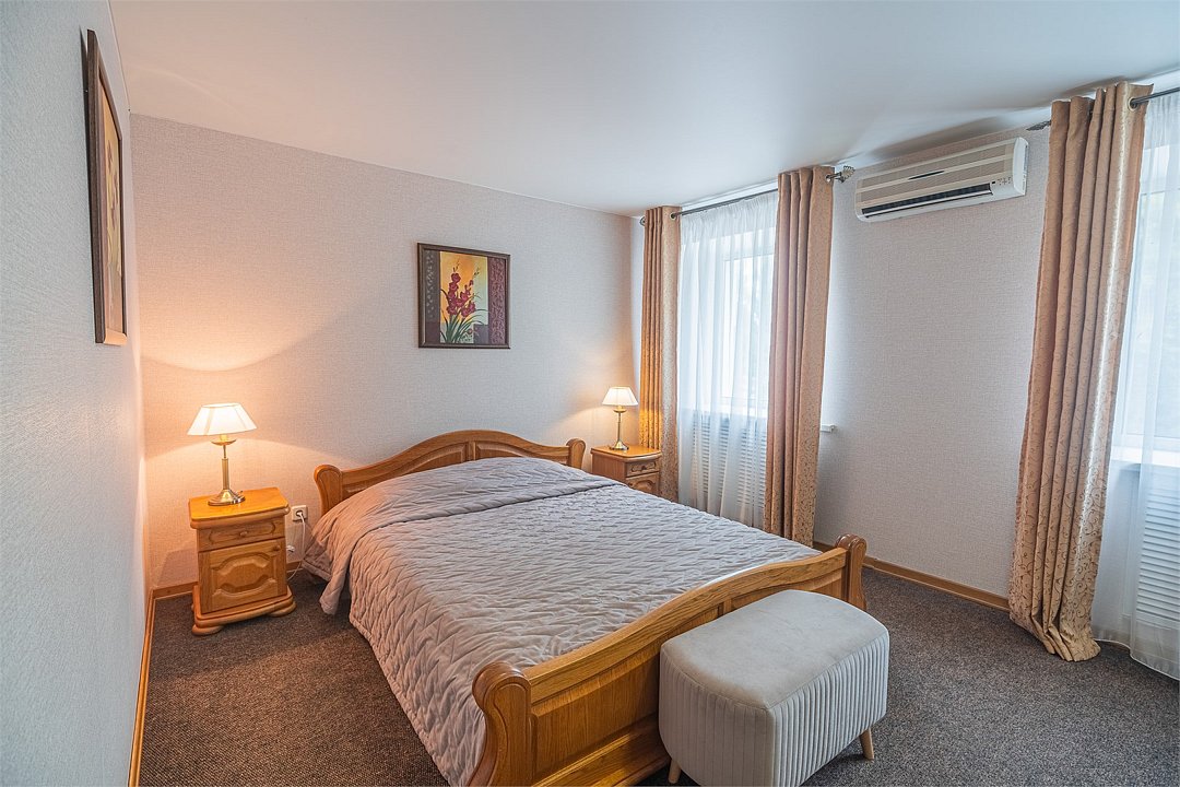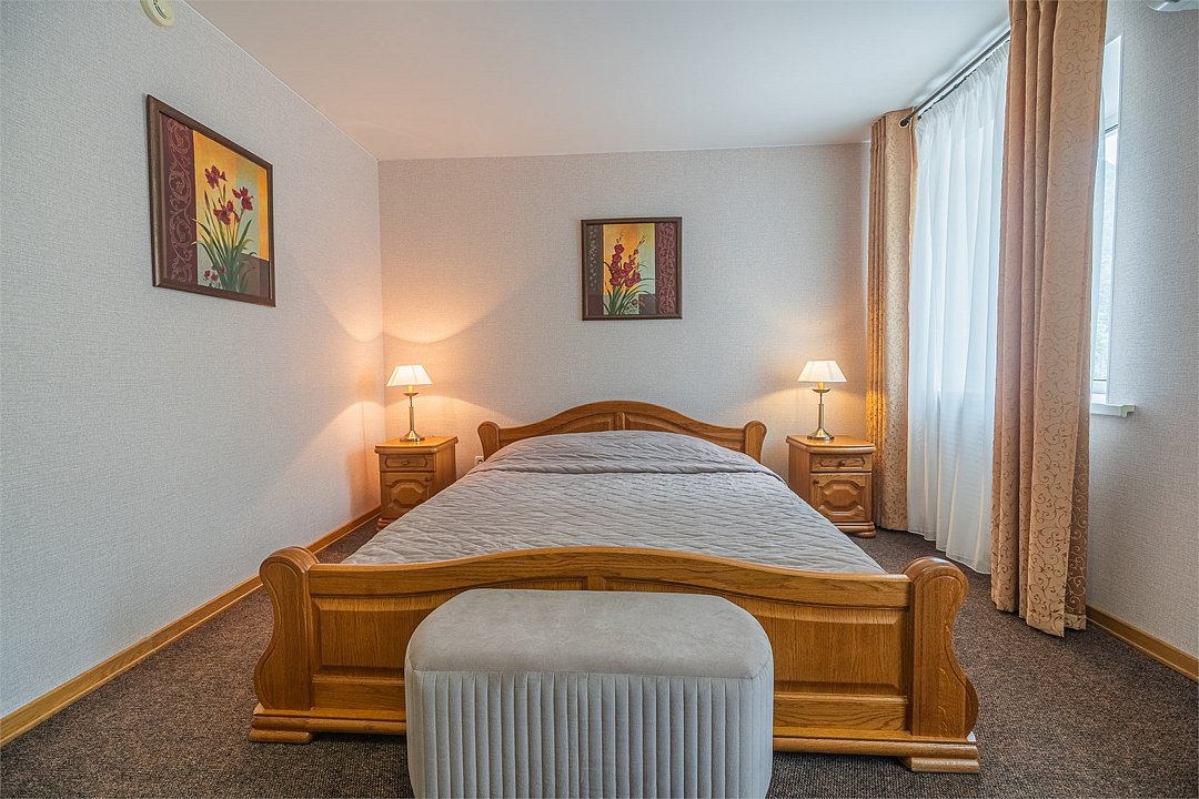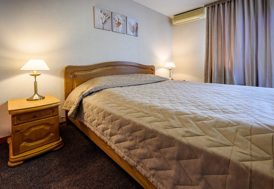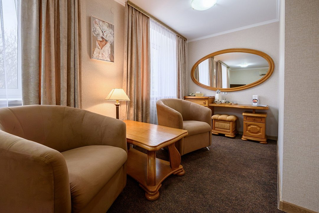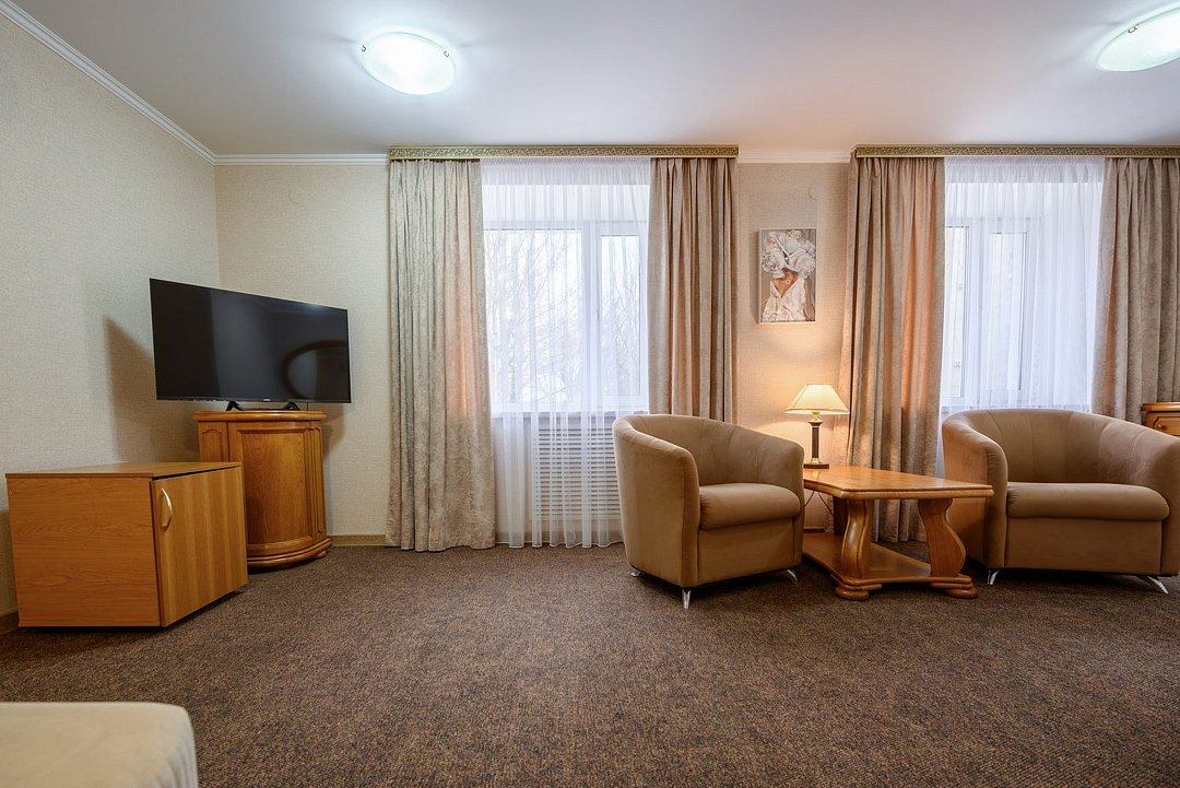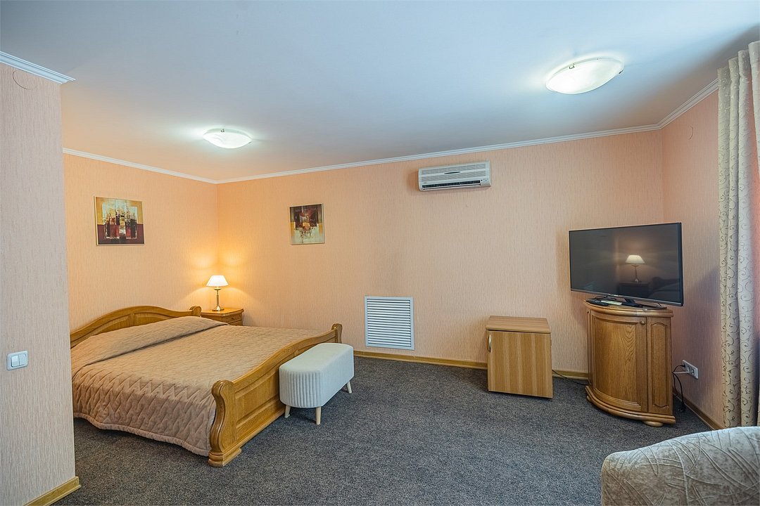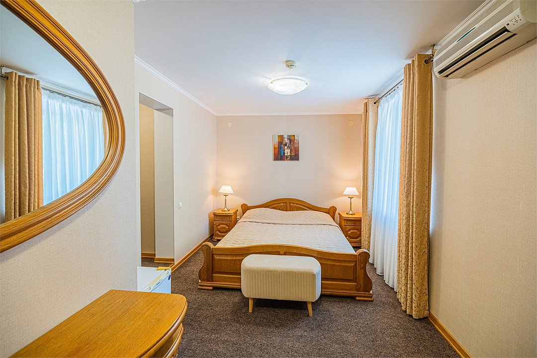 В номере имеется все необходимое для комфортного отдыха. Номер разделен на две зоны: спальную и гостиную, рассчитан на проживание одного или двух человек и имеет одну двуспальную кровать, мягкую мебель, оснащен сплит-системой, имеет отдельную туалетную комнату с ванной. К услугам наших гостей телефон, телевизор, холодильник, интернет. В стоимость номера входит завтрак с 7:00 до 10:00, крытый бассейн (в зимний период) с 7 до 9 утра и открытый бассейн (в летний период) с 10:00 до 21:00.Услуги и удобства