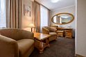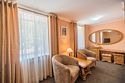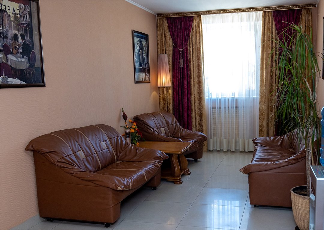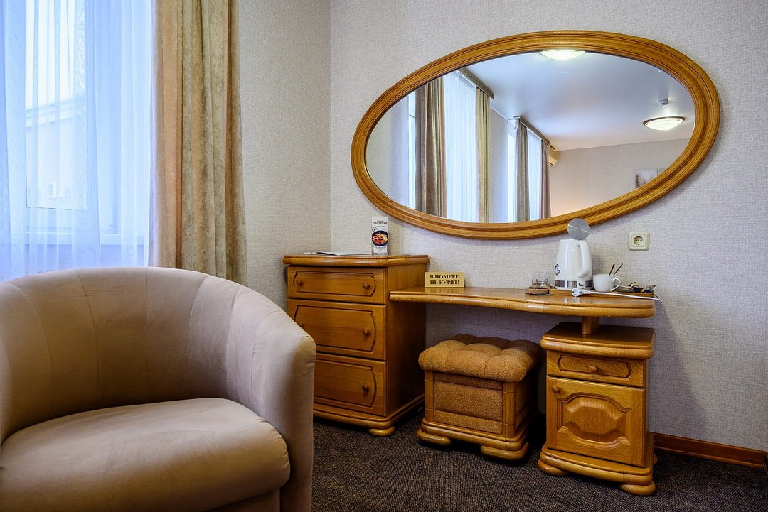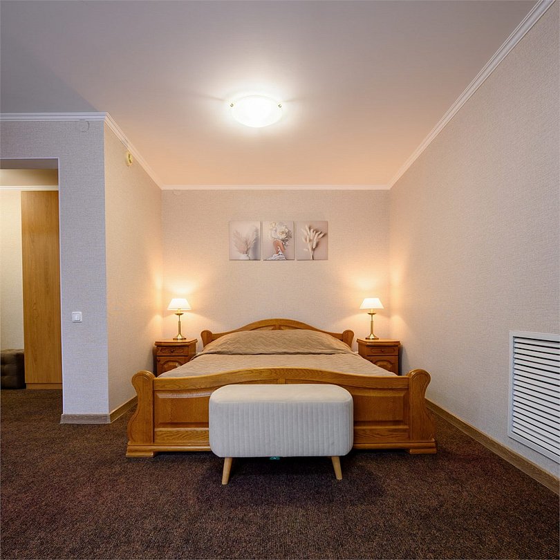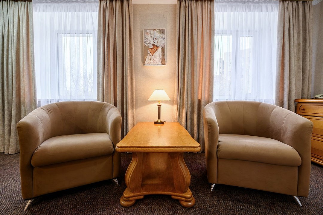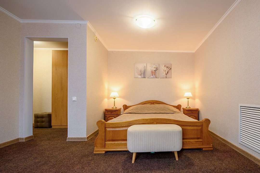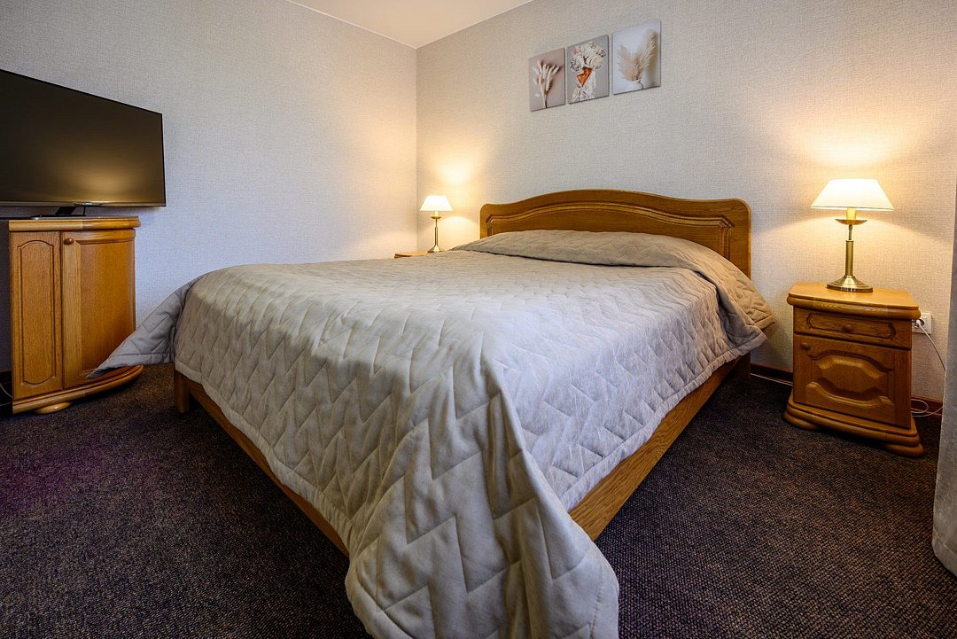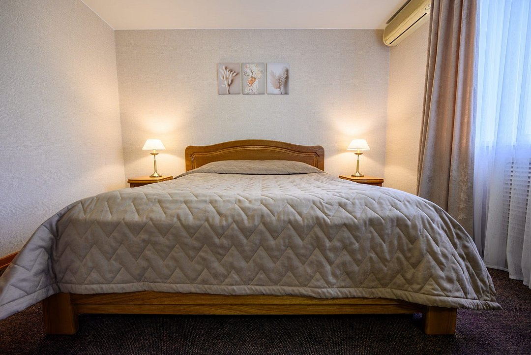 В номере имеется все необходимое для комфортного отдыха. Номер разделен на две зоны: спальную и гостиную, рассчитан на проживание одного или двух человек и имеет одну двуспальную кровать, мягкую мебель, оснащен сплит-системой, имеет отдельную туалетную комнату с ванной. К услугам наших гостей телефон, телевизор, холодильник, интернет. В стоимость номера входит завтрак с 7:00 до 10:00, крытый бассейн (в зимний период) с 7 до 9 утра и открытый бассейн (в летний период) с 10:00 до 21:00.Услуги и удобства