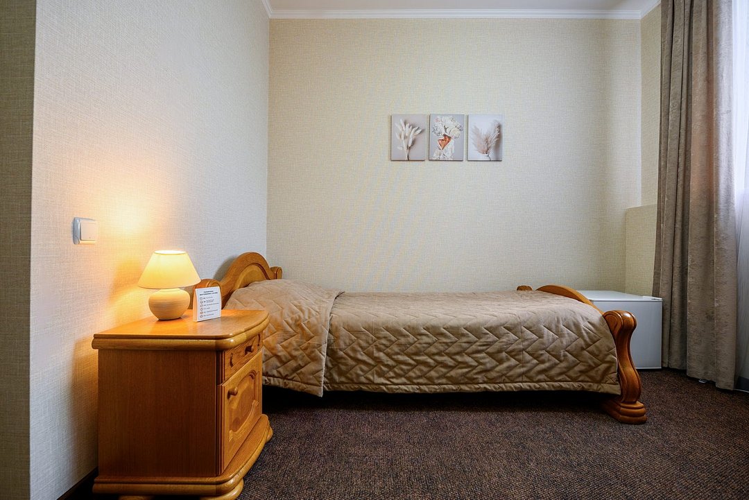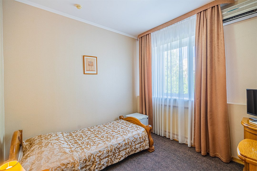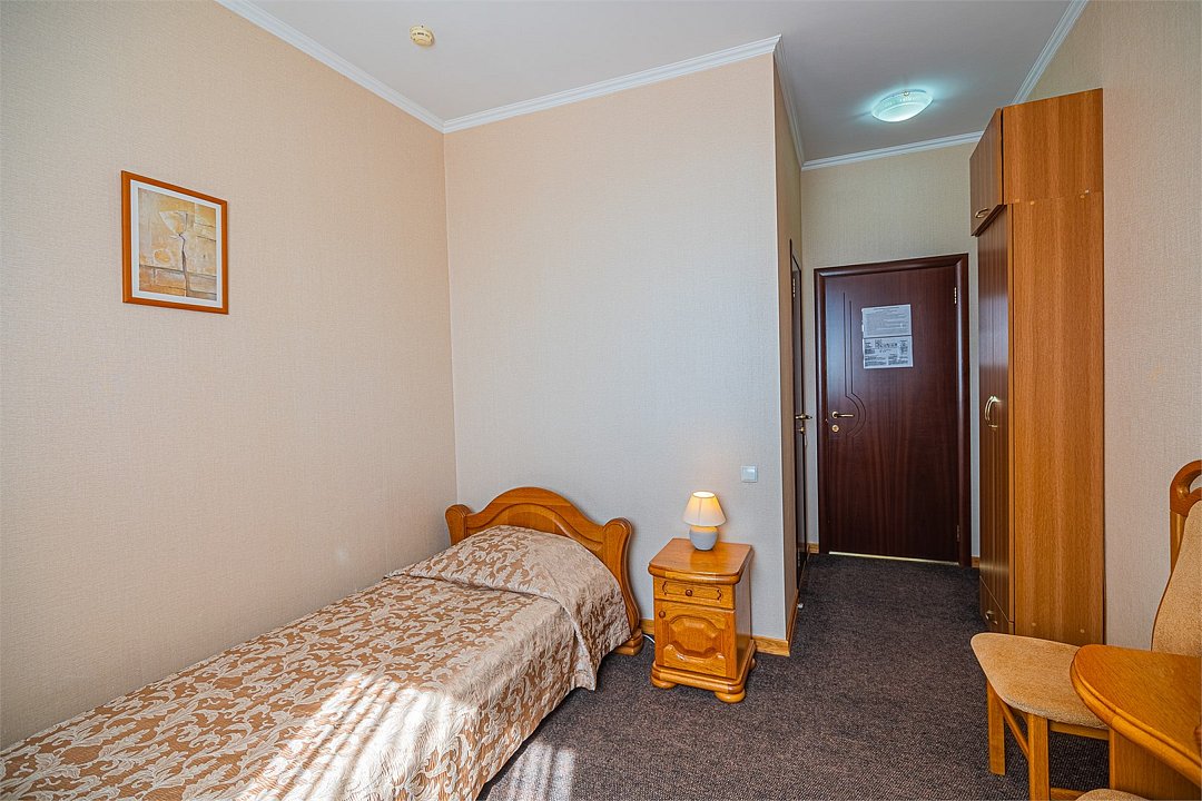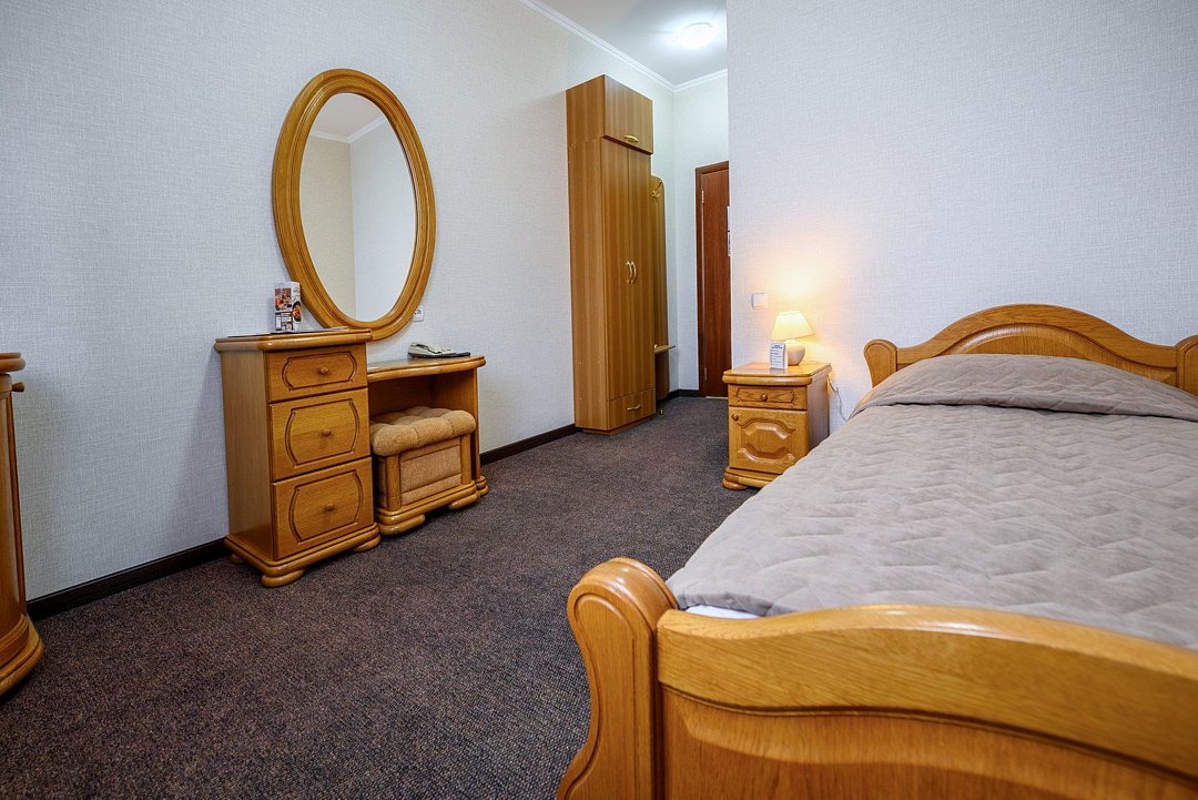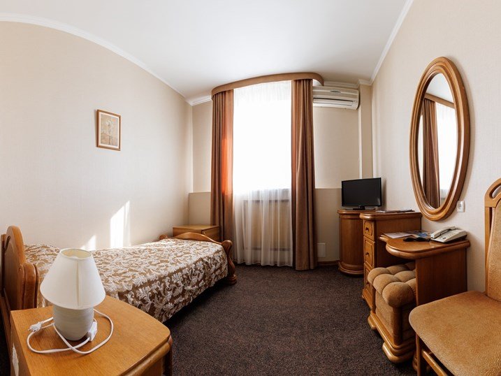 В номере имеется все необходимое для комфортного отдыха. Номер рассчитан на проживание одного или двух человек и имеет одну двуспальную кровать, оснащен сплит-системой, имеет отдельную туалетную комнату с ванной. К услугам наших гостей телефон, телевизор, холодильник, интернет. В стоимость номера входит завтрак с 7:00 до 10:00, крытый бассейн (в зимний период) с 7 до 9 и открытый бассейн в летний период с 10:00 до 21:00.Услуги и удобства