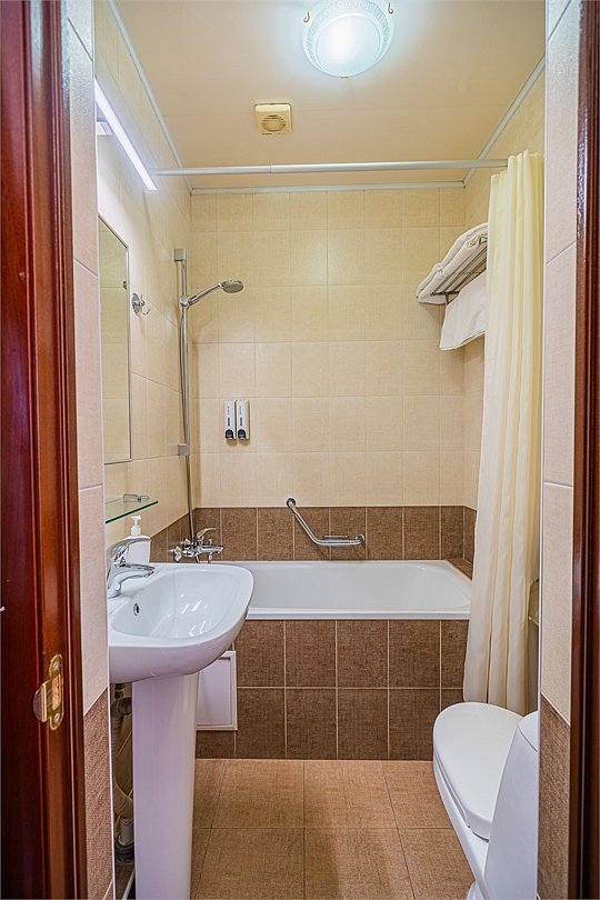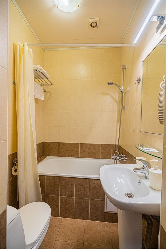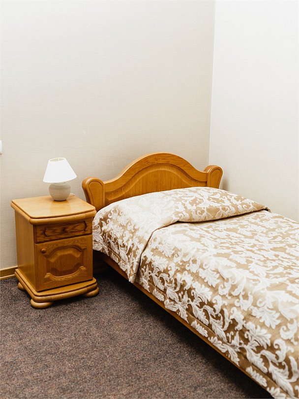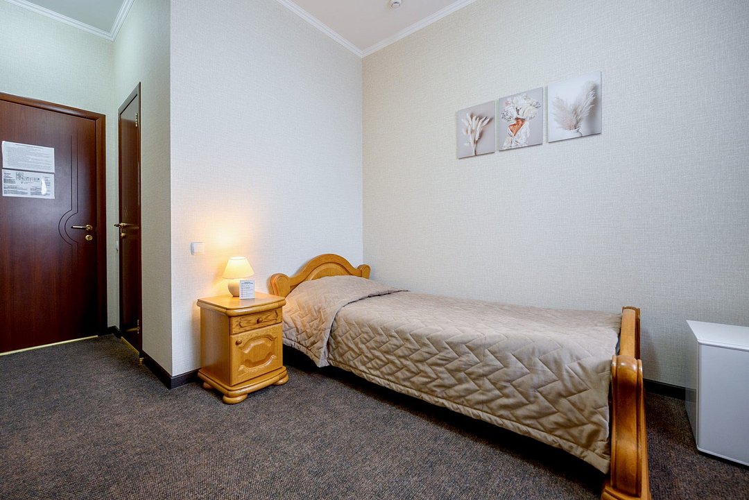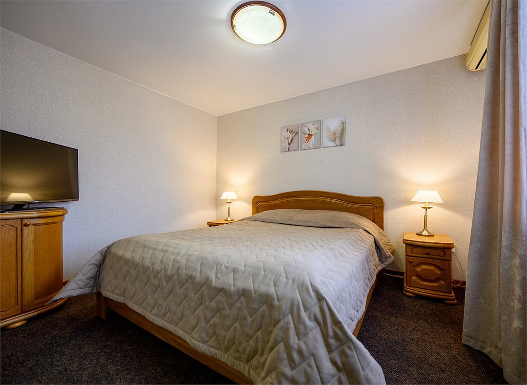 В номере имеется все необходимое для комфортного отдыха. Номер рассчитан на проживание одного или двух человек и имеет одну двуспальную кровать, оснащен сплит-системой, имеет отдельную туалетную комнату с ванной. К услугам наших гостей телефон, телевизор, холодильник, интернет. В стоимость номера входит завтрак с 7:00 до 10:00, крытый бассейн (в зимний период) с 7 до 9 и открытый бассейн в летний период с 10:00 до 21:00.Услуги и удобства