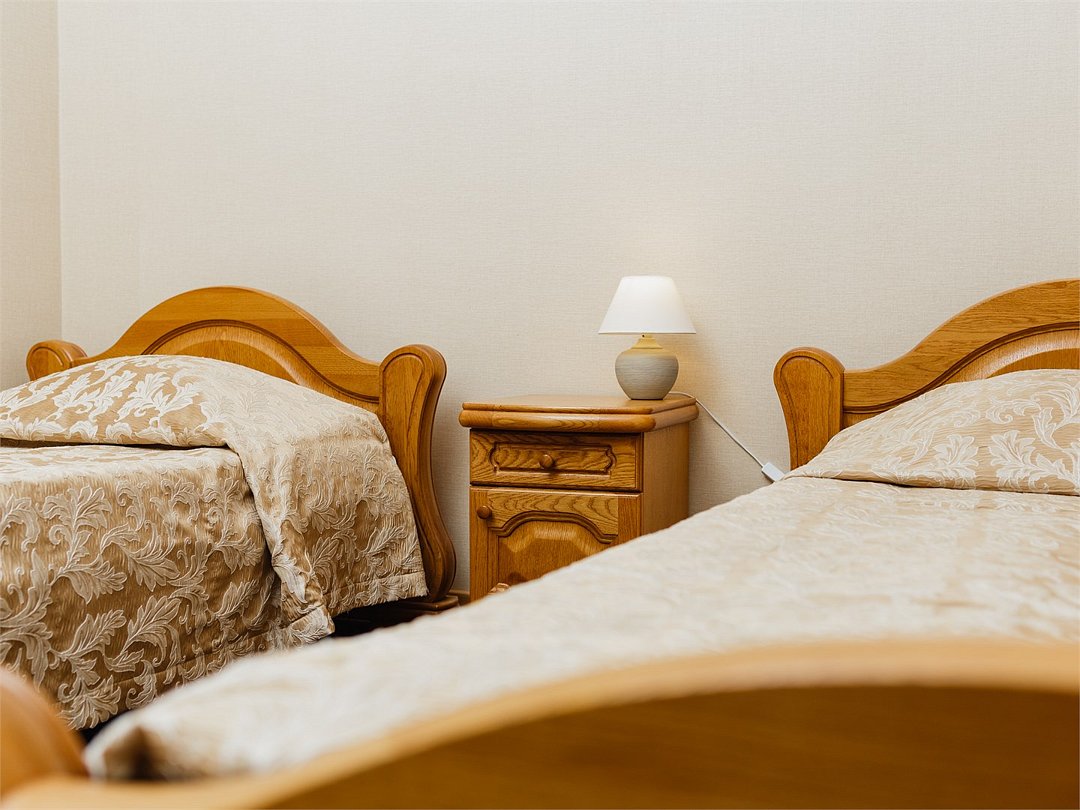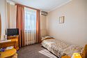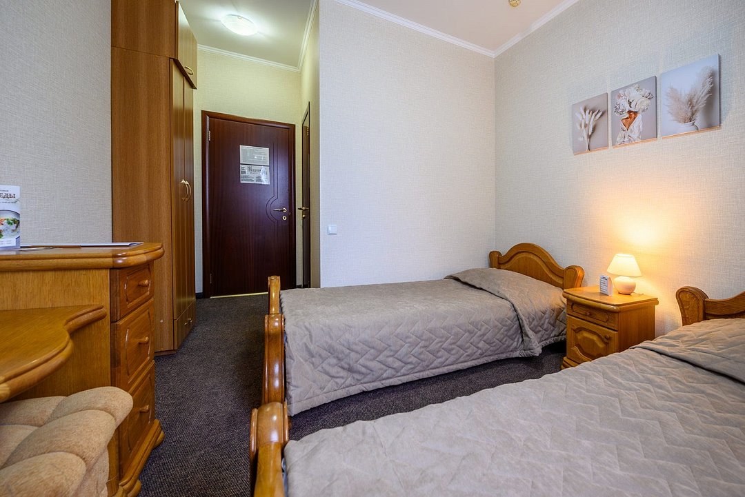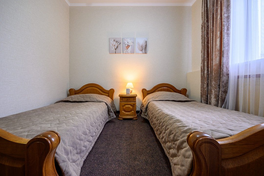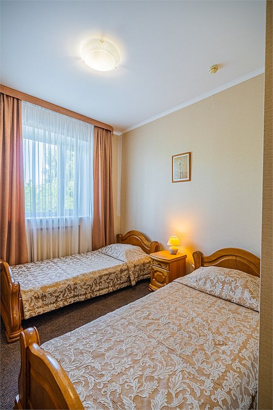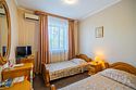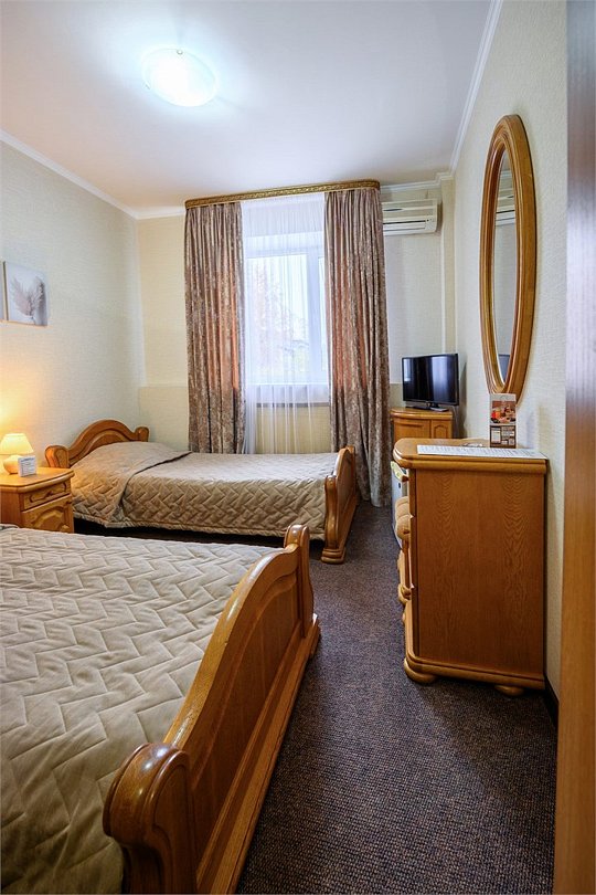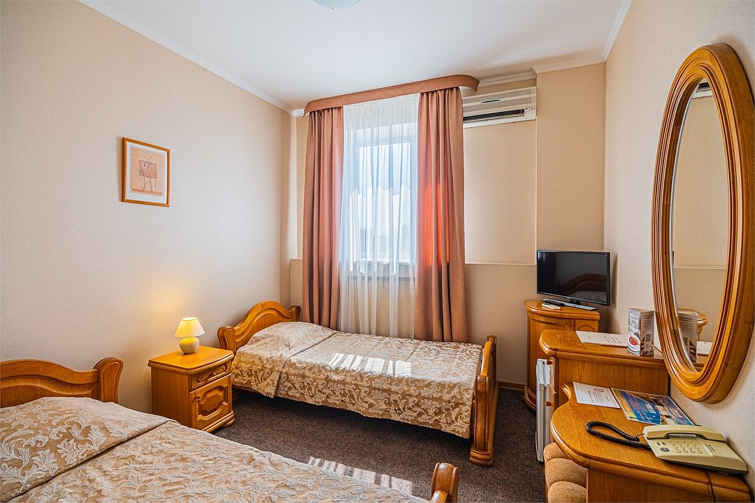 В номере имеется все необходимое для комфортного отдыха. Номер рассчитан на проживание двух человек и имеет две кровати, оснащен сплит-системой, имеет отдельную туалетную комнату с ванной. К услугам наших гостей телефон, телевизор, холодильник, интернет. В стоимость номера входит завтрак с 7:00 до 10:00, крытый бассейн (в зимний период) с 7 до 9 утра и открытый бассейн (в летний период) с 10:00 до 21:00.Услуги и удобства