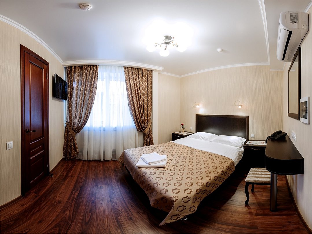 телевизор, Wi-Fi, кондиционер, светильник, настольные лампы, фен, душевая кабина, санузел, халаты, банные полотенца, тапочки, косметические средства, две односпальные или большая двуспальная кровать, стулья, шкаф для одежды, вешалки, письменный стол, багажная тумба, унитаз, раковина, душ, вид на город, вид во двор, стул, стол, тумба, туалетные средства, туалет, сплит-система, телевизор с плоским экраном, мини-холодильник, шкаф-купе, гостиничная парфюмерия, рабочий стол, мыло, без питомцевВ номере