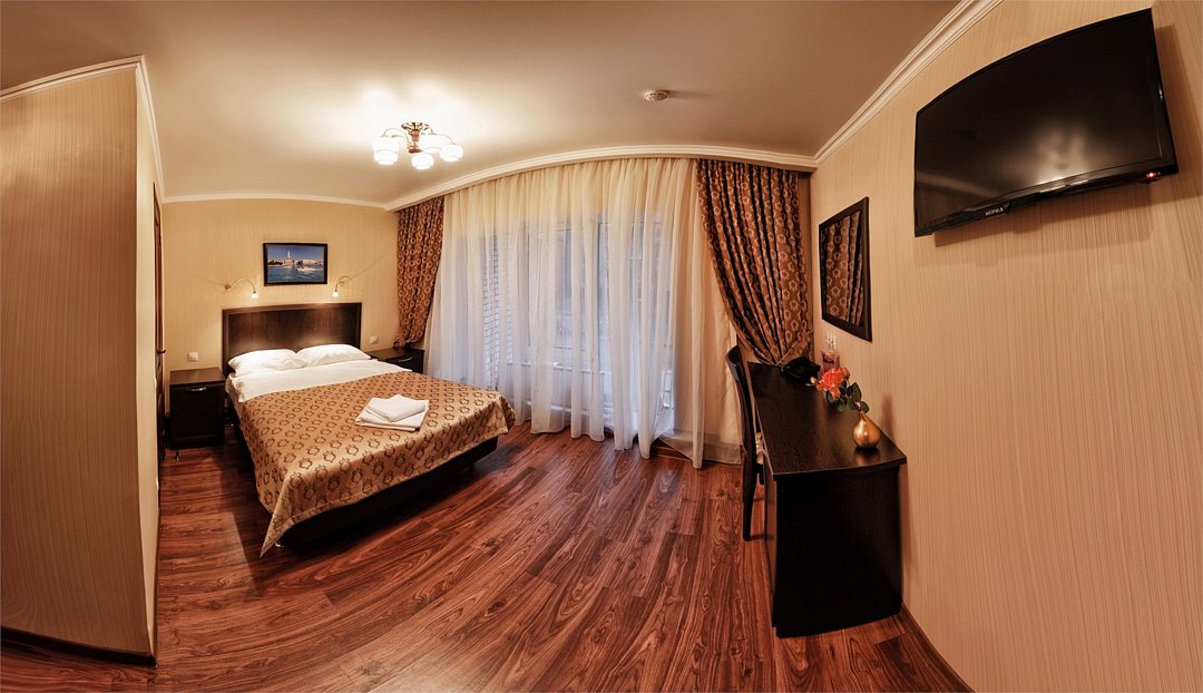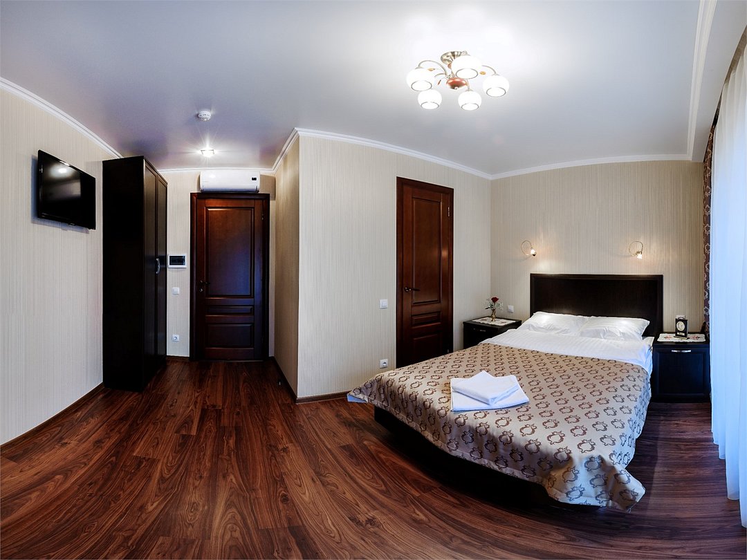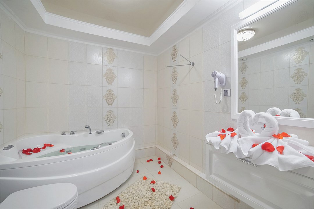 телевизор, Wi-Fi, кондиционер, светильник, настольные лампы, фен, ванная комната, ванна, ванна или душевая кабина, аэромассажная ванна, гидромассажная ванна, санузел, биде, халаты, банные полотенца, тапочки, косметические средства, двуспальная кровать, стулья, вешалки, багажная тумба, унитаз, вид во двор, стул, тумба, туалетные средства, туалет, сплит-система, телевизор с плоским экраном, мини-холодильник, шкаф-купе, гостиничная парфюмерия, рабочий стол, джакузи, мыло, без питомцевВ номере