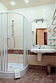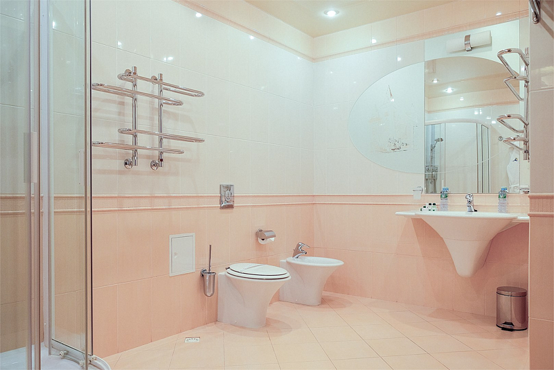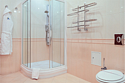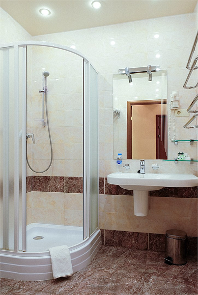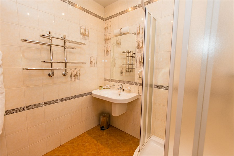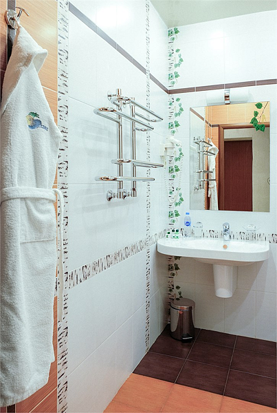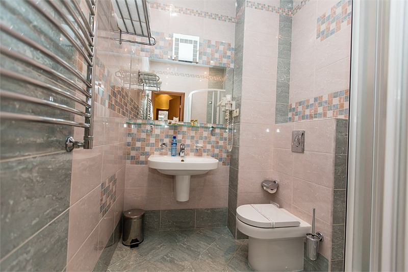 Весь интерьер номера выполнен в классическом стиле мировых отелей этой категории. Нежные тона облицовочных плит ванной комнаты придают ей изысканность и шарм.