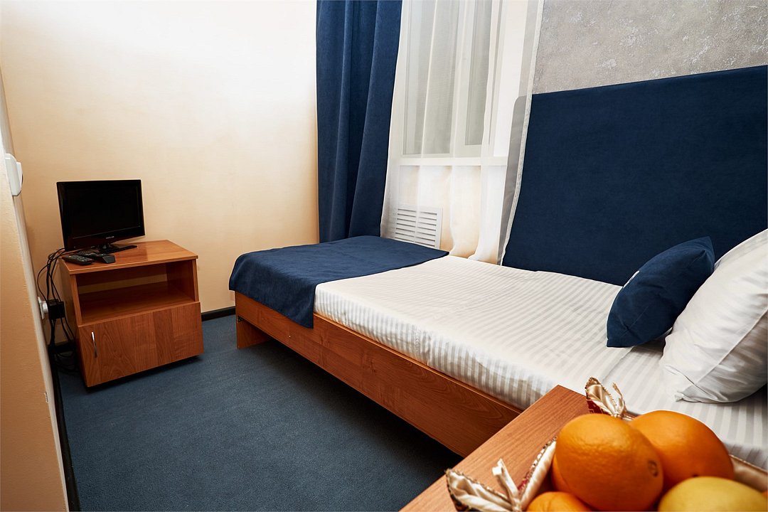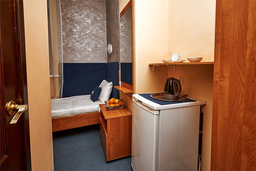 Небольшой номер на одного человека, площадью 10 кв. метров. В номере есть односпальная кровать. Для вашего удобства номер оснащен шкафом, тумбой, телевизором, холодильником. Вы можете согреться горячим чаем, так как есть электрический чайник и набор чашек. Ванная комната оборудована душевой кабиной. каждому гостю выдается 2 полотенца, шампунь, гель для душа и мылоУслуги и удобства