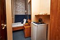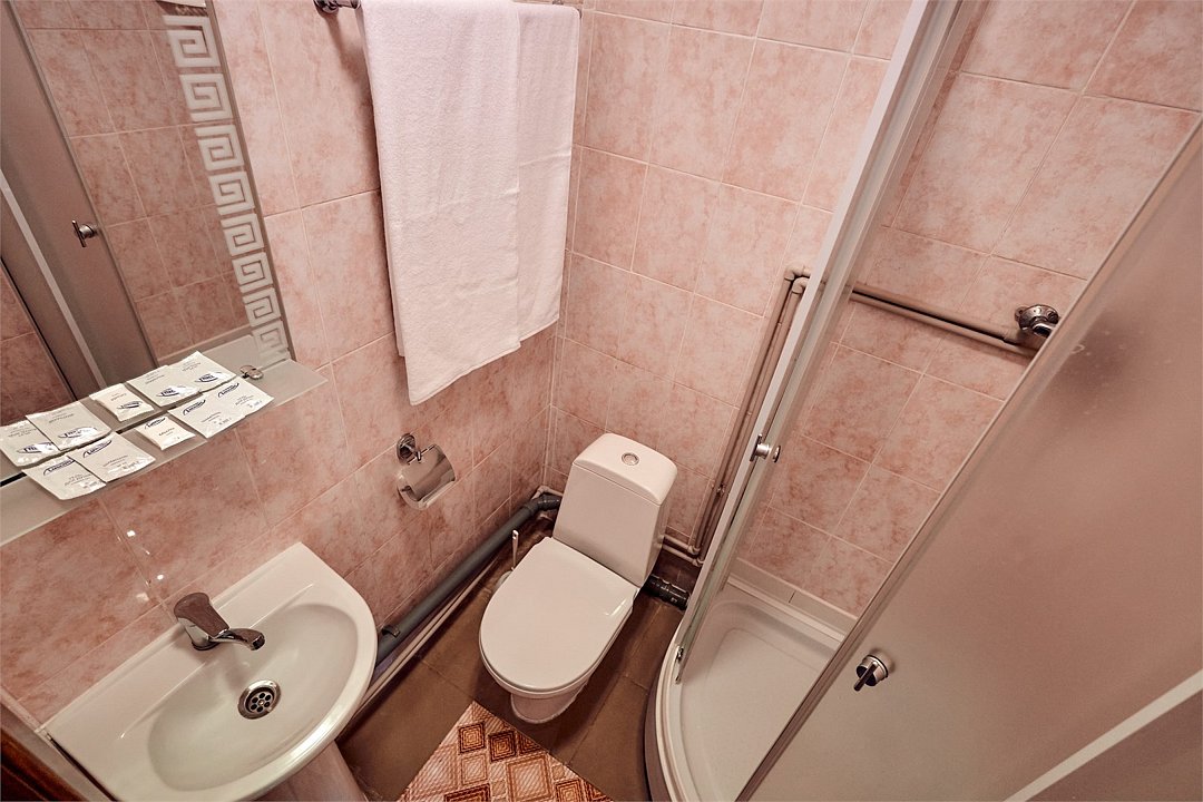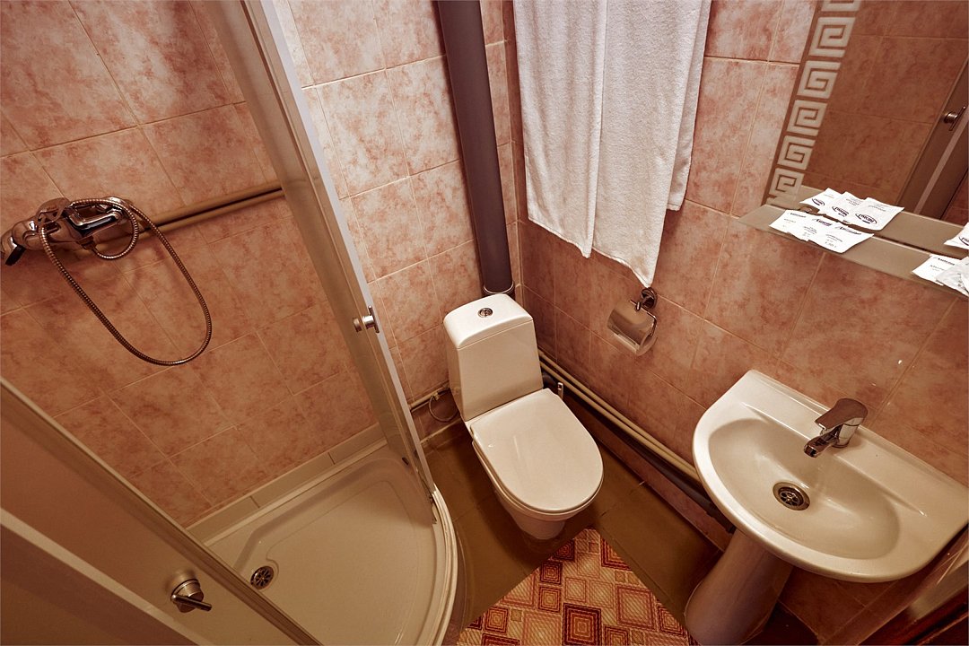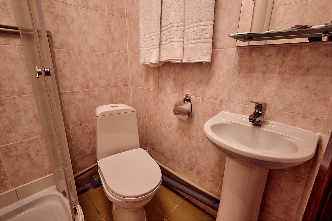 Вместительный номер на троих человек, площадью 18 кв. метров. В номере двухспальная и односпальная кровати. Для вашего удобства номер оснащен шкафом, тумбой, телевизором, холодильником. Вы можете согреться горячим чаем, так как есть электрический чайник и набор чашек. Ванная комната оборудована душевой кабиной. каждому гостю выдается 2 полотенца, шампунь, гель для душа и мылоУслуги и удобства