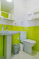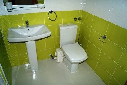 В ванной комнате: душ, туалет, раковина, фен, душевые принадлежности.