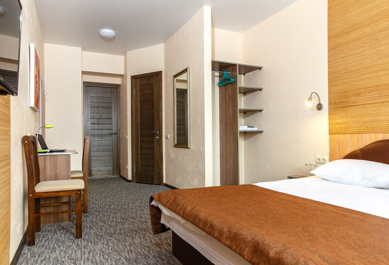 В номере: 2-спальная кровать с ортопедическим матрасом, шкаф, прикроватная тумба, компьютерный столик, стул, ТВ с USB, кондиционер, зеркало.