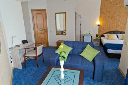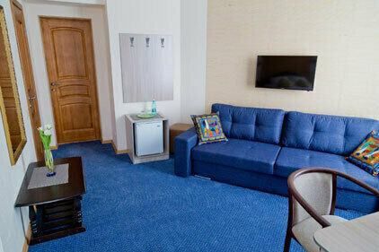 В номере: широкая 2-спальная кровать с ортопедическим матрасом, прикроватная тумба, диван, журнальный столик, ТВ с USB, кондиционер, зеркало, сейф, гардероб.