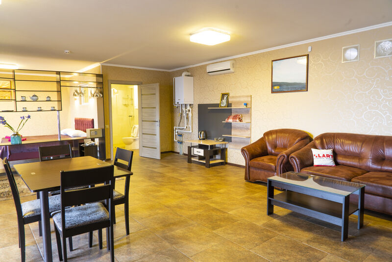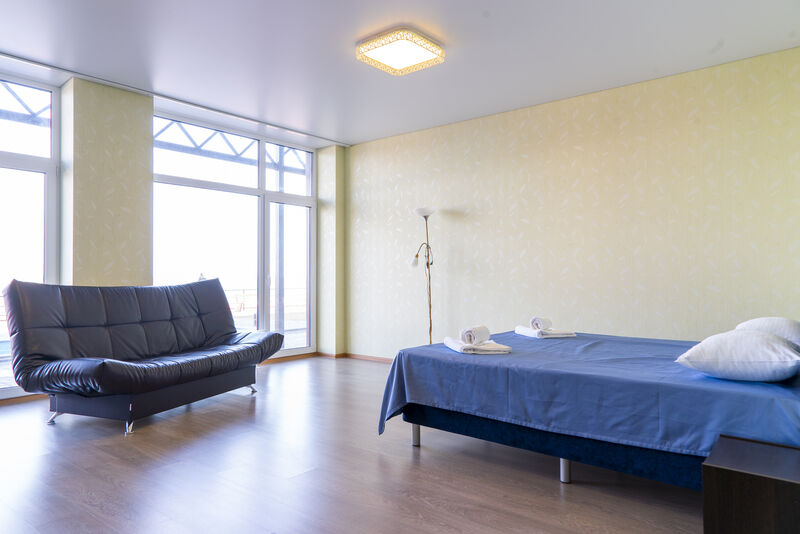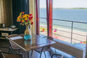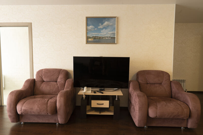 Площадь 49 кв.м., первая линия от Волги с шикарным панорамным видом даже в ванной! Большой балкон. В номере находится двуспальная кровать размера кинг-сайз, раскладной диван, два кресла, большой телевизор, санузел с душем, фен, кондиционер.