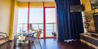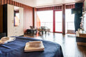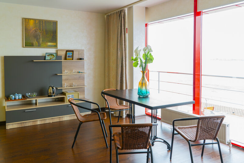Панорамное остекление, шикарный вид на Волгу, индивидуальный выход к бассейну. В номере находятся большая кровать, раскладной диван, телевизор, санузел с душем, сейф, холодильник. Возможно дополнительное место в номере.