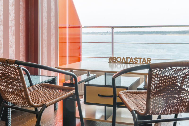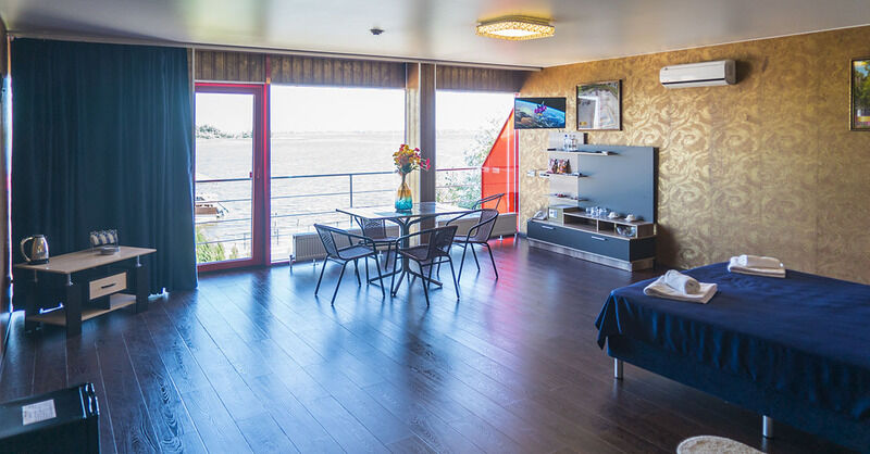 Панорамное остекление, шикарный вид на Волгу, балкон, либо собственный вход. В номере: большая двуспальная кровать, телевизор, санузел с душем, кондиционер.