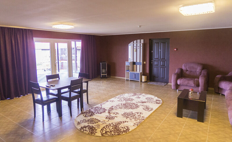 В номере находится мини-кухня, двуспальная кровать, телевизор, санузел с душем, фен, сейф, камин, двуспальный диван.