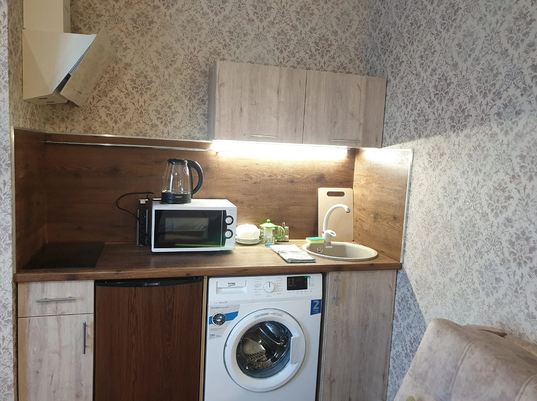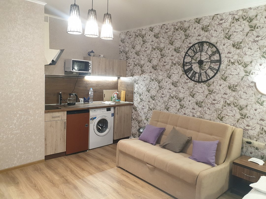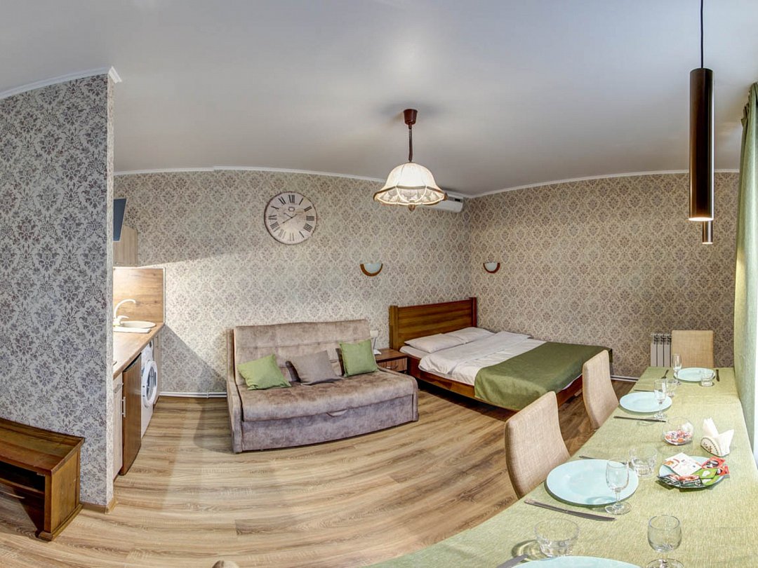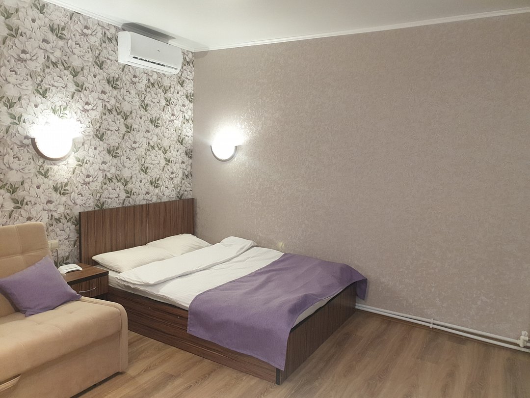 1 этажный однокомнатный дом студия. Дом полностью мебелирован , 4 спальных мест, постельное белье, средства личной гигиены, тапочки и посуда, во дворе : беседка, джакузи , мангал, стоянка для авто.В номере