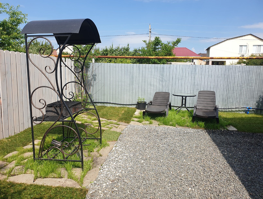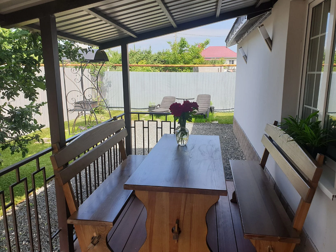 1 этажный однокомнатный дом студия. Дом полностью мебелирован , 4 спальных мест, постельное белье, средства личной гигиены, тапочки и посуда, во дворе : садовая мебель , мангал, стоянка для авто.В номере