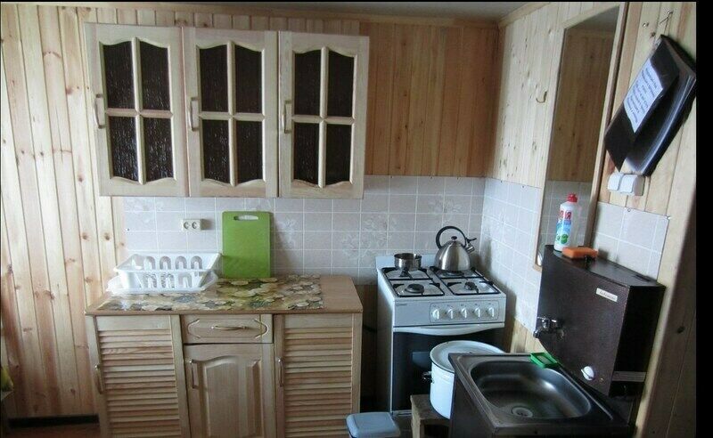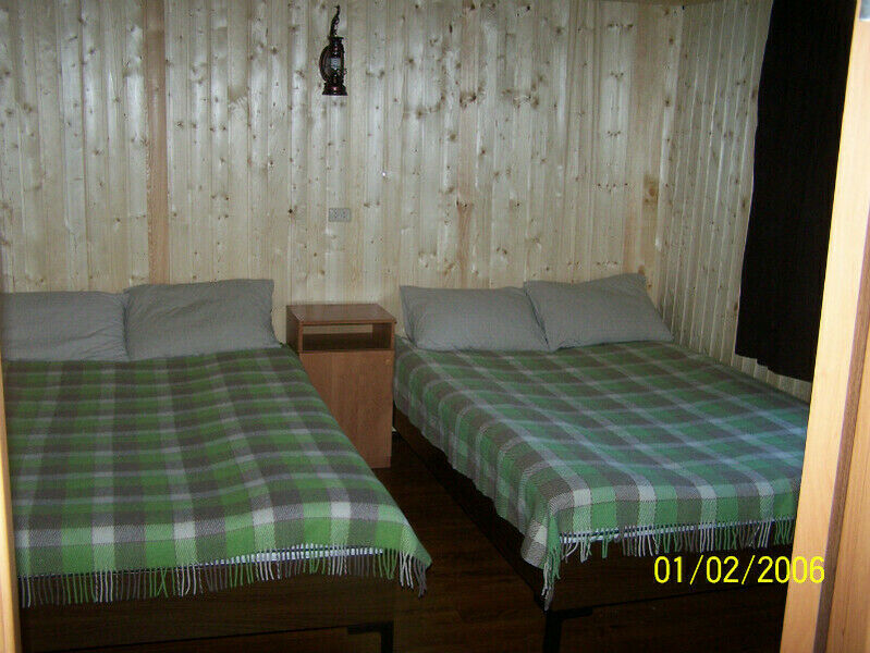кухонная зона (печь, посуда, умывальник), в комнате две двуспальные кровати и раскладной диван (как дополнительное место), вся мебель новая, удобства на территории.