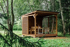 Особое внимание уделено организации мероприятий любого формата. На просторном участке леса разместился пати-тент, который станет идеальной площадкой для тимбилдинга, ретрита или фестиваля. Уютные беседки приглашают отдохнуть вдвоем или всей семьей, а костровая зона объединяет гостей вокруг живого огня, создавая атмосферу тепла и единства.