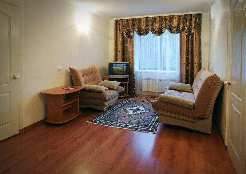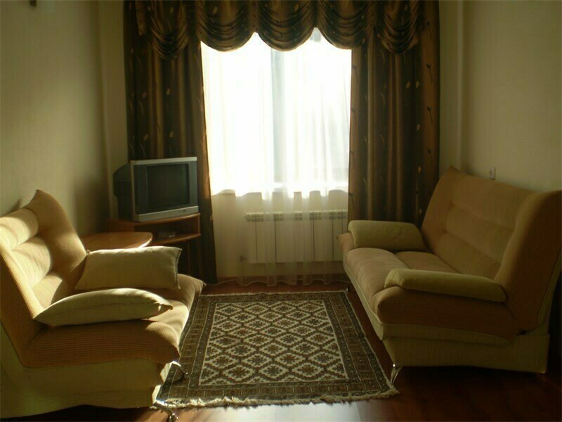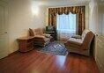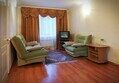Спальня и комната отдыха. В спальне – двуспальная кровать, тумбочки, плательный шкаф, туалетный столик, 2 стула. В комнате отдыха: мягкая мебель, телевизор, холодильник, журнальный столик, плательный шкаф. Диван раскладывается. Душ, большая угловая ванна и туалет в номере.