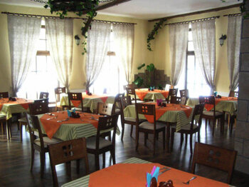 На территории комплекса находится вместительное кафе «Жарки» на 100 посадочных мест и кафе «Шинок».
