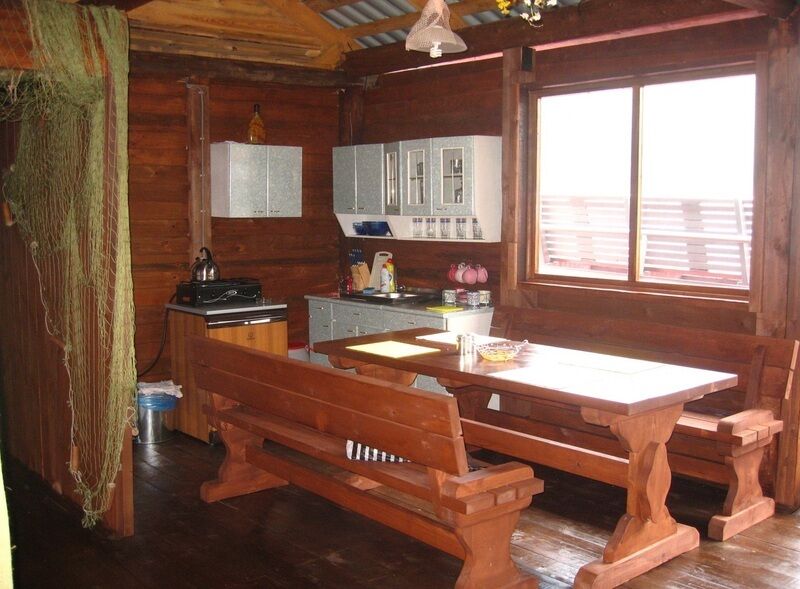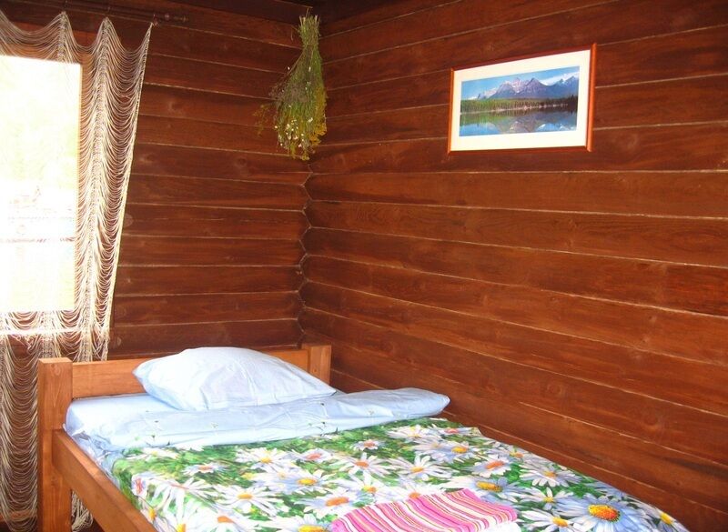 В доме есть две спальни, кухня, большая гостиная, баня, комната отдыха и площадка с навесом для загара. Дом оснащен биотуалетом. Предоставляется постельное белье и вся необходимая посуда европейского качества, мангал, уголь, шампура, набор для барбекю. К вашему распоряжению холодильник, электричество от генератора, газовая плита, водопровод, радиоприемник. В бане для вас заготовлены простыни, веники и таежные травы.