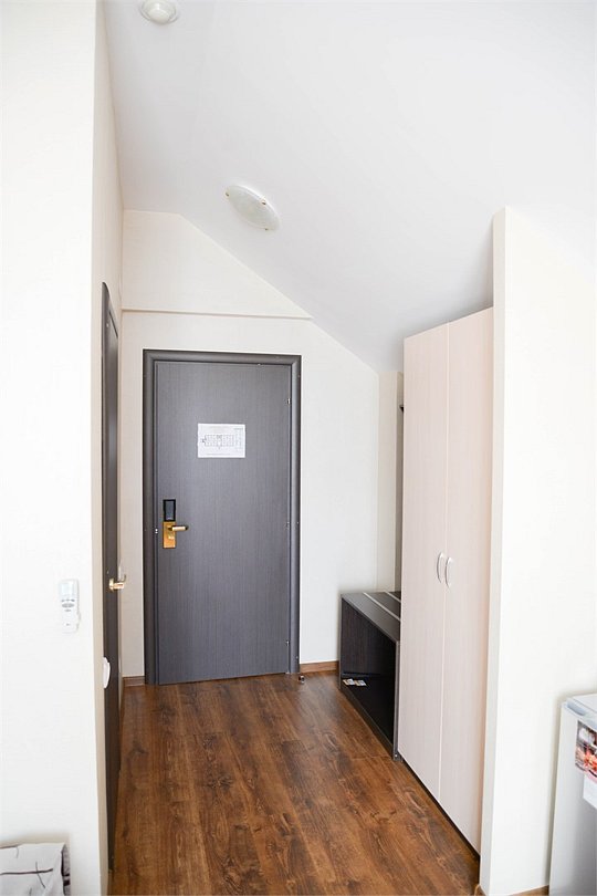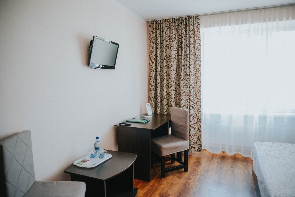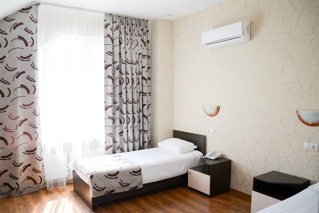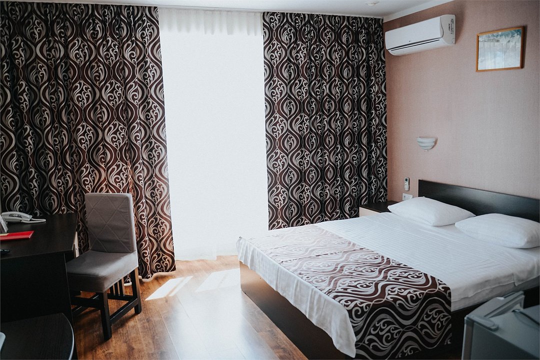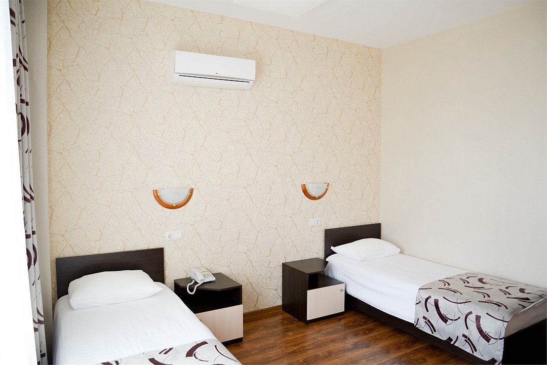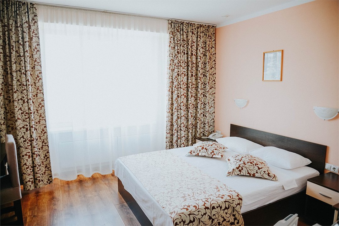 Номер площадью 24-26 кв.м., состоящий из одной жилой комнаты с 2-спальной кроватью, санузел с душевой кабиной. Комплектация: телевизор, телефон, холодильник, продукция индивидуального пользования, фенУслуги и удобства
