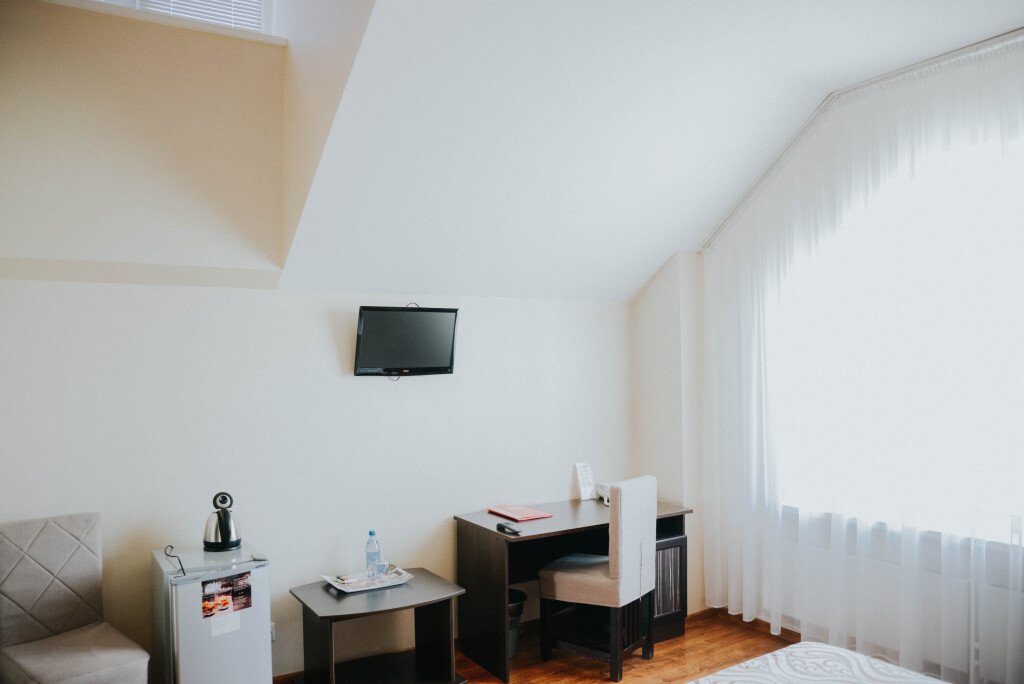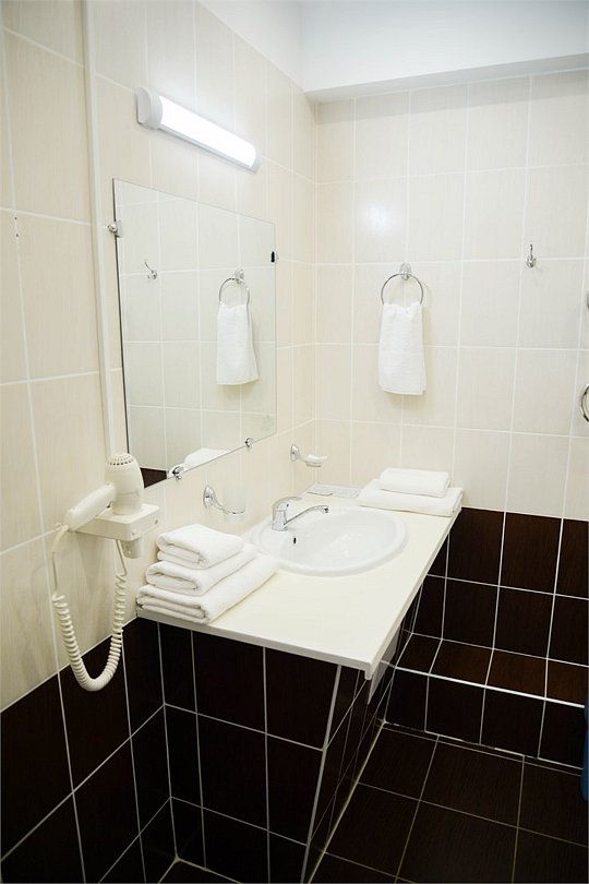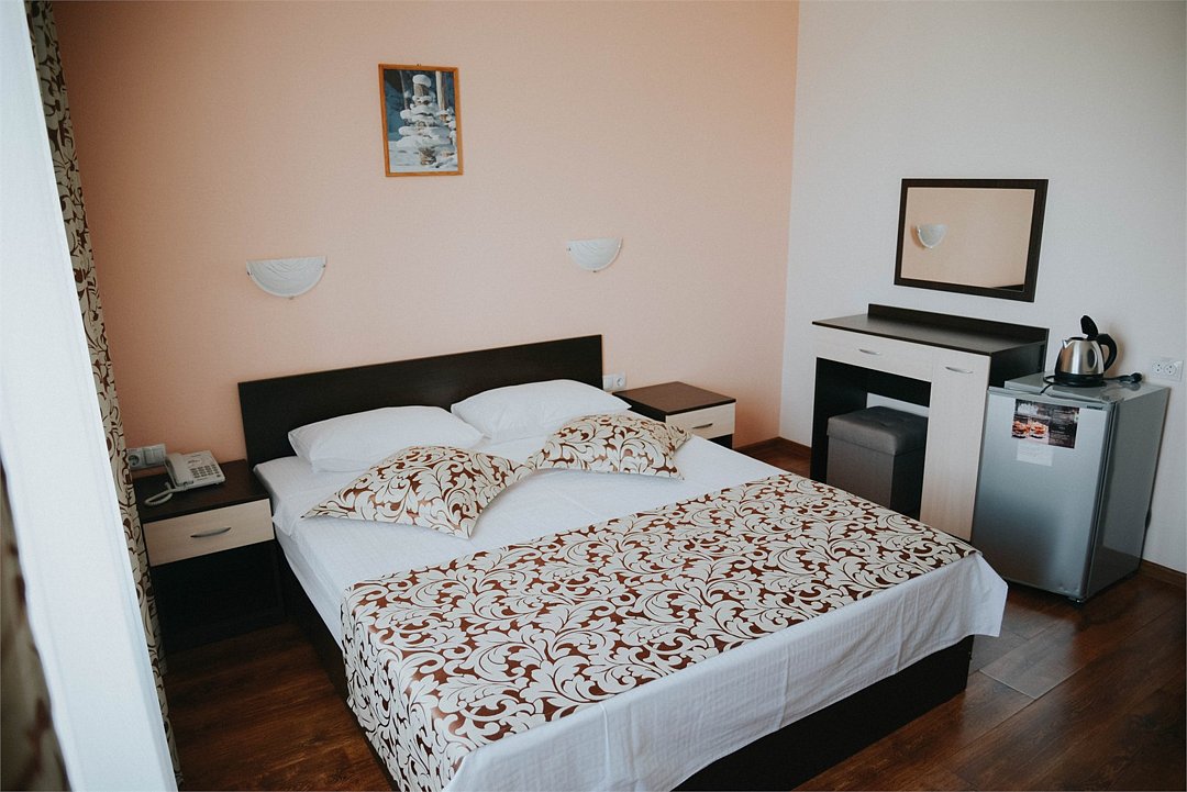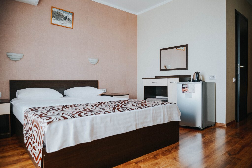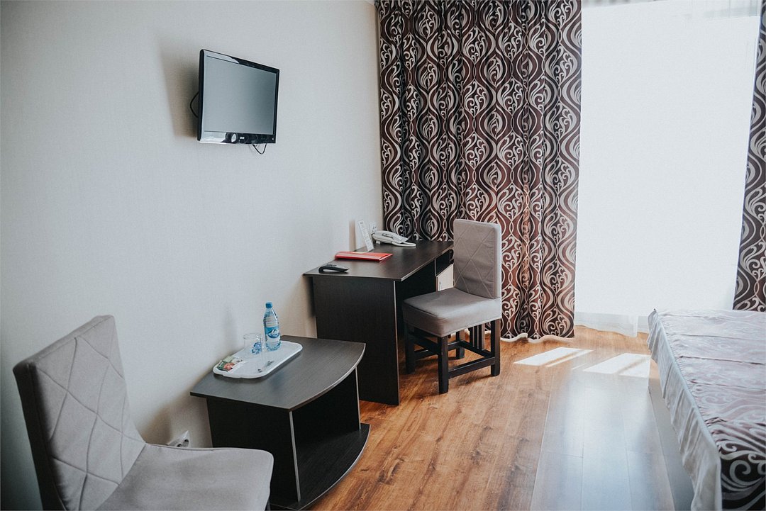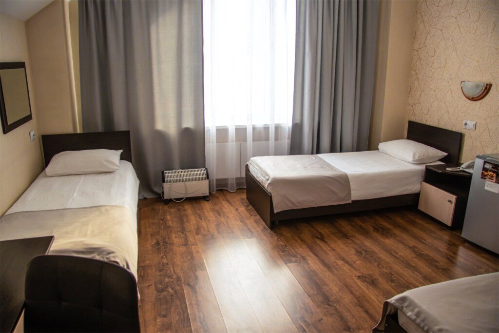 Номер площадью 24-26 кв.м., состоящий из одной жилой комнаты с 2-спальной кроватью, санузел с душевой кабиной. Комплектация: телевизор, телефон, холодильник, продукция индивидуального пользования, фенУслуги и удобства