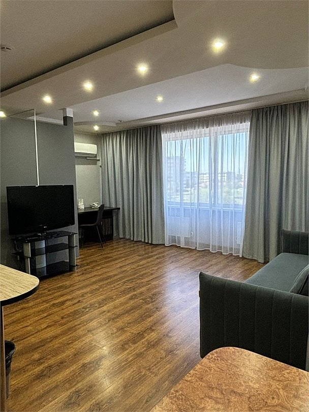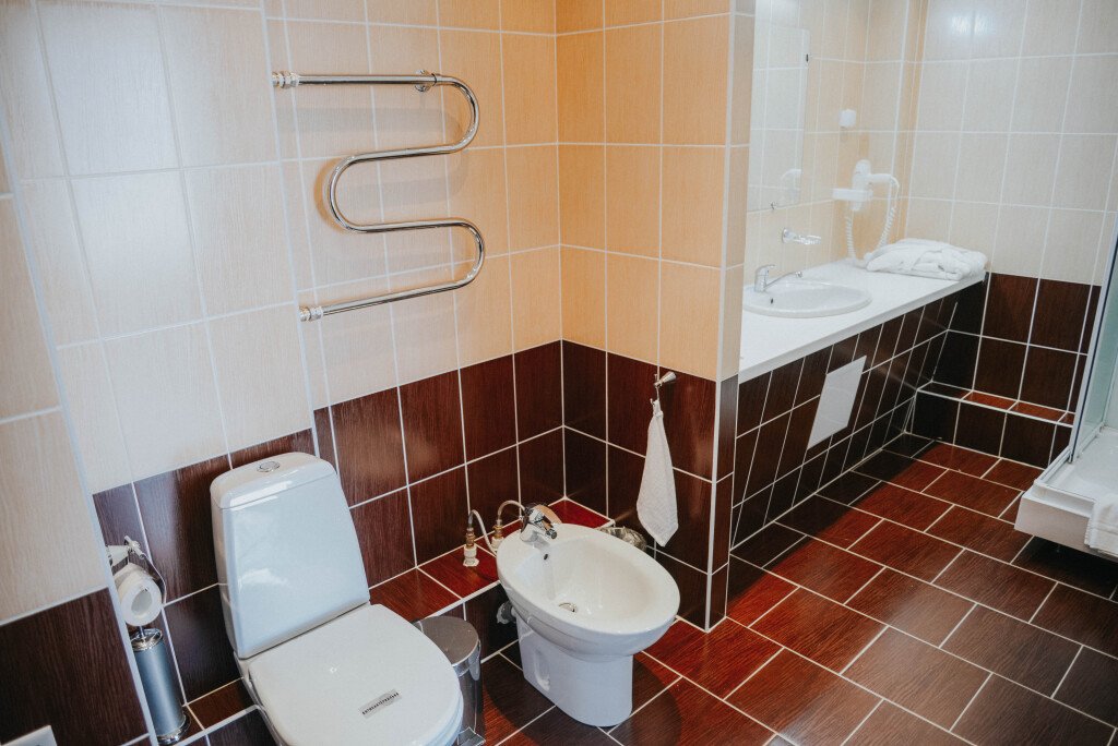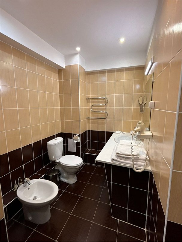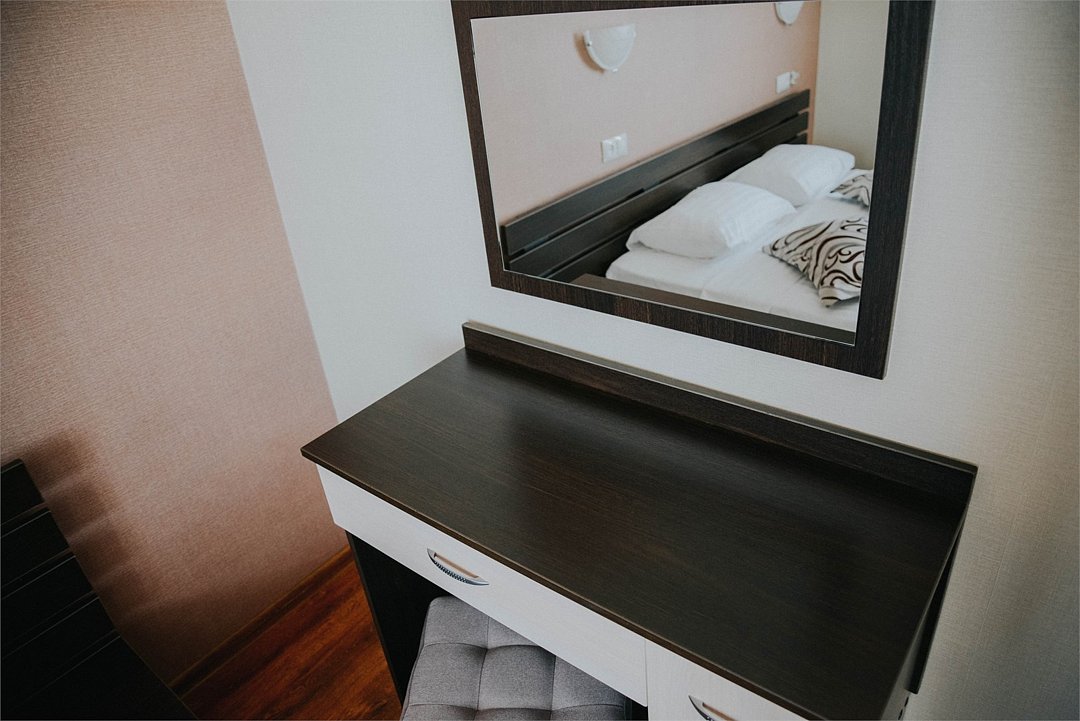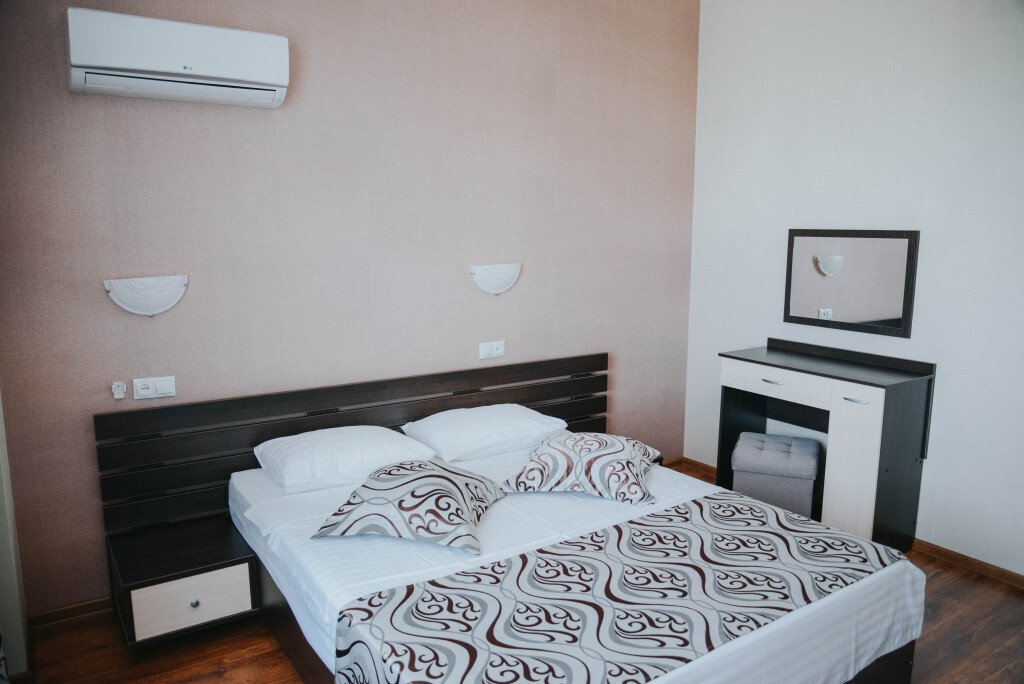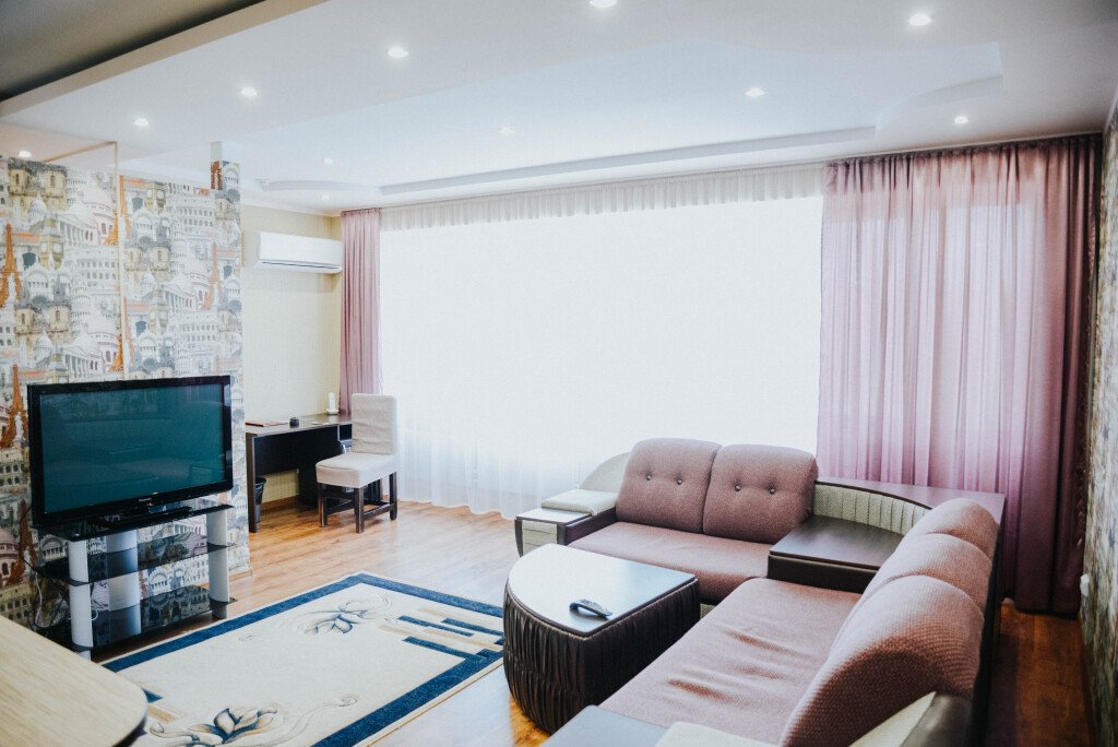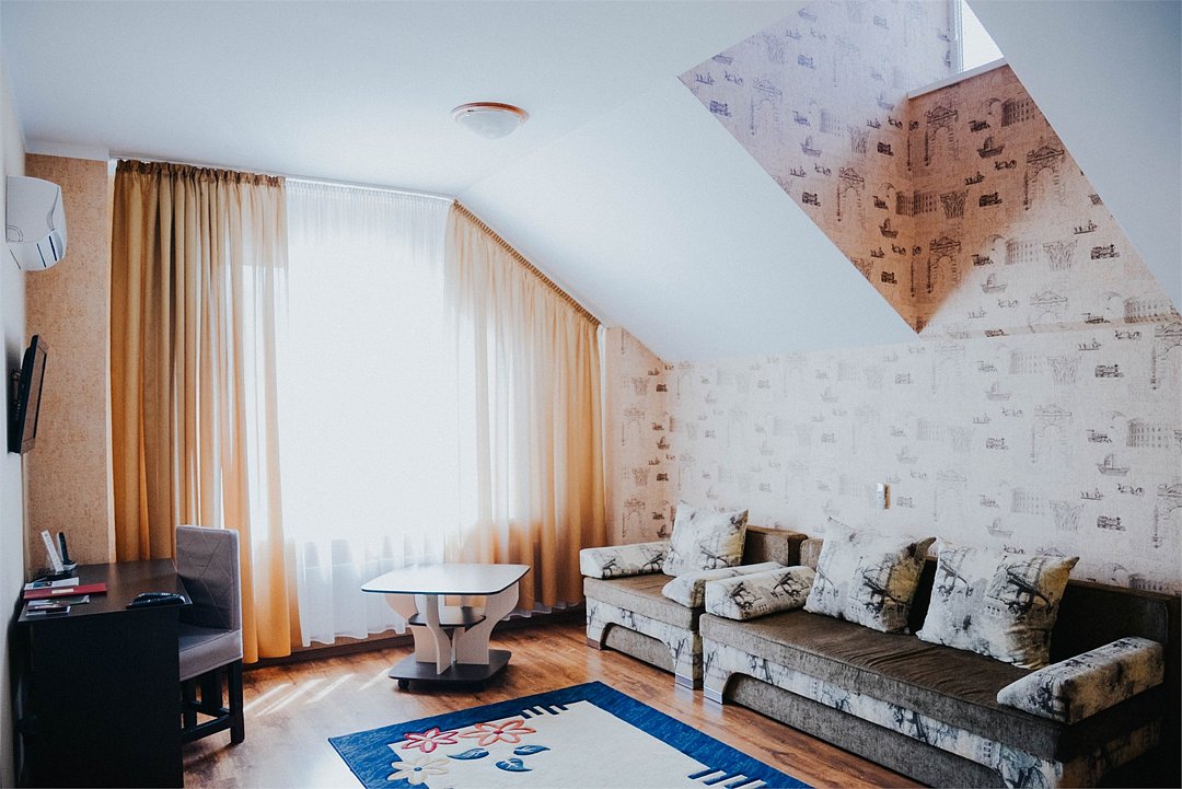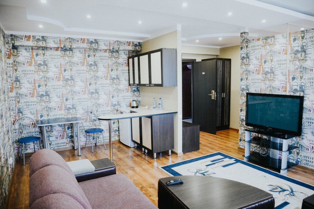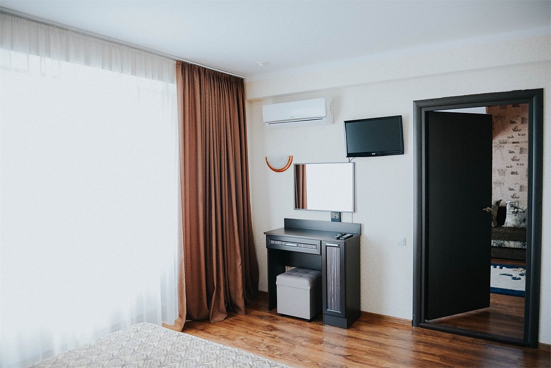 Номер площадью 50 кв.м., состоящий из двух жилых комнат (гостиная и спальня), санузел с душевой кабиной. Комплектация: телевизор, телефон, холодильник, продукция индивидуального пользования, фен, кондиционер.Услуги и удобства