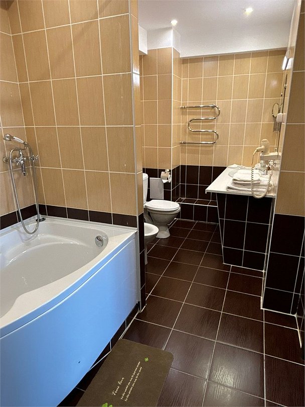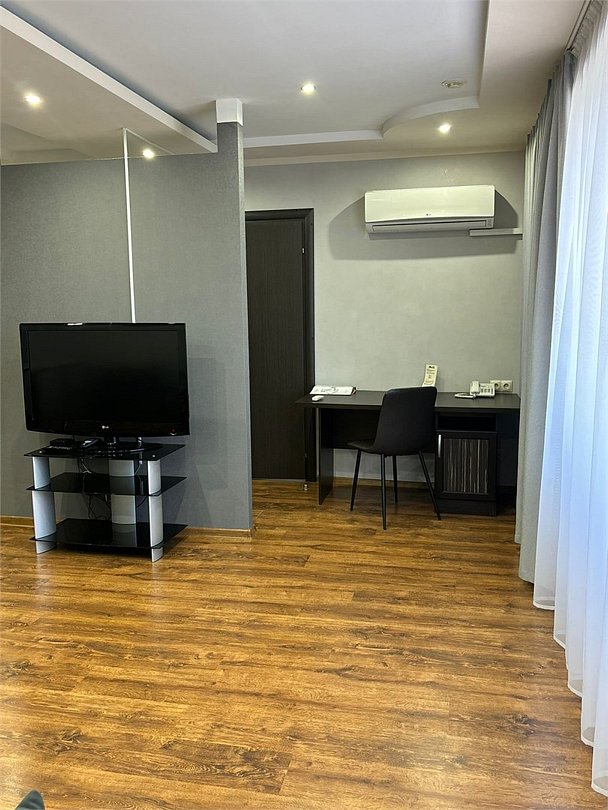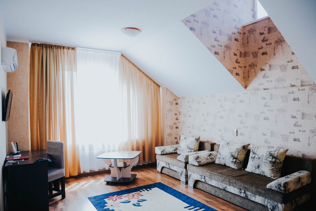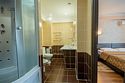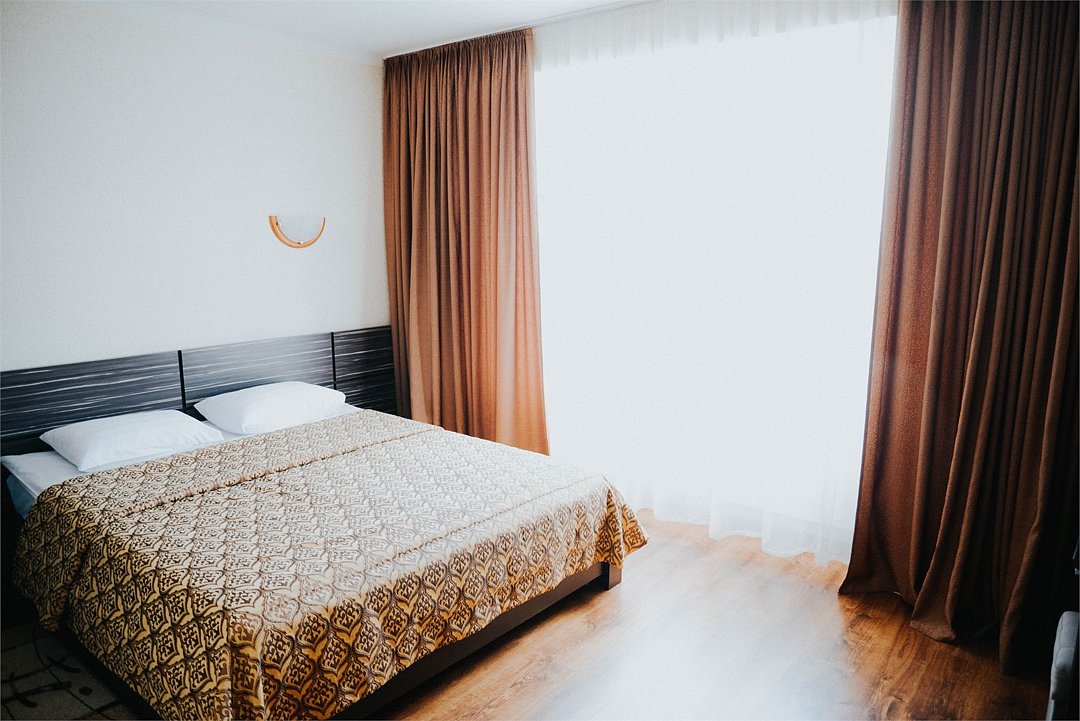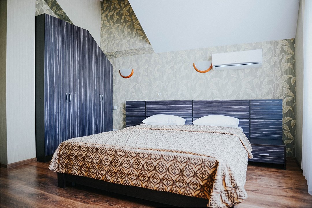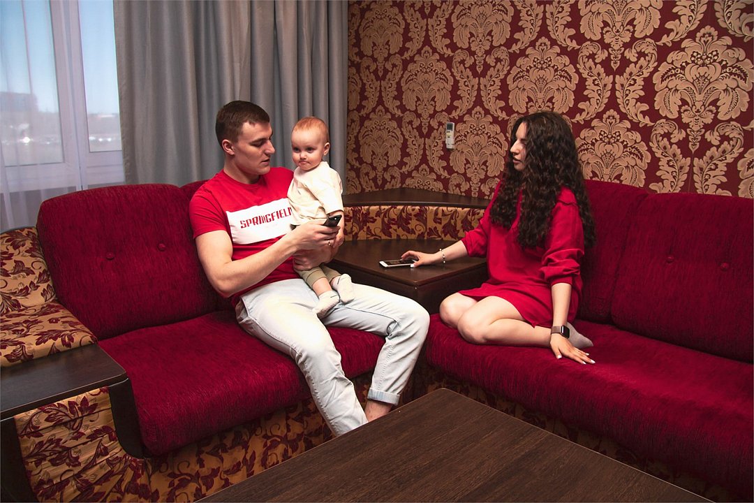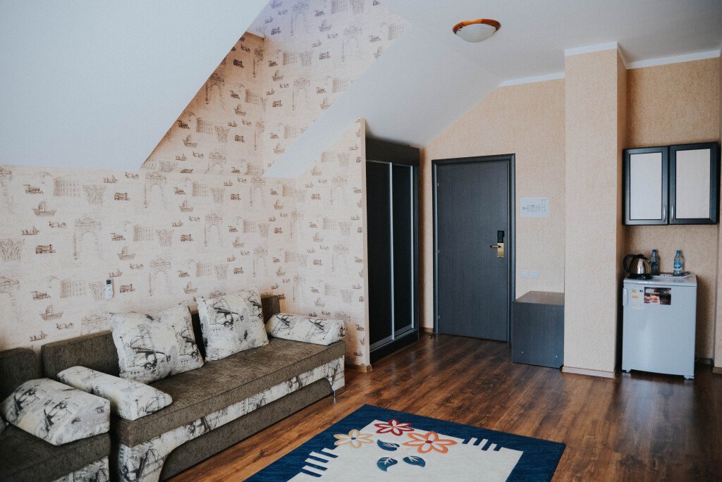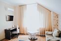 Номер площадью 62 кв.м., состоящий из двух жилых комнат (гостиная с зоной бара и спальня), санузел с душевой кабиной. Комплектация: телевизор, телефон, холодильник, продукция индивидуального пользования, фен, кондиционер.Услуги и удобства