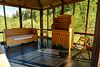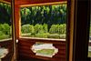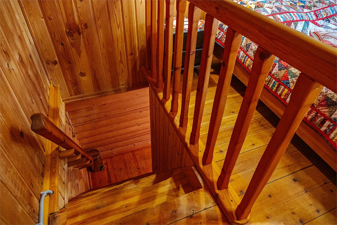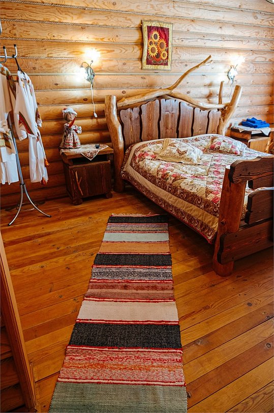 На втором этаже находится комфортабельная спальня с двуспальной кроватью, телевизором и выходом на балкон, с которого открываются великолепные виды на окружающую природу. В спальне также есть прикроватные тумбочки и вешалки для одежды.