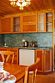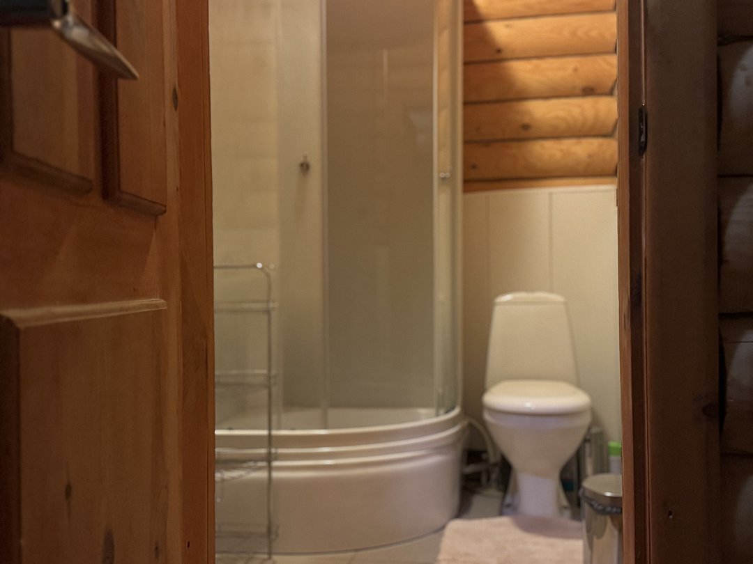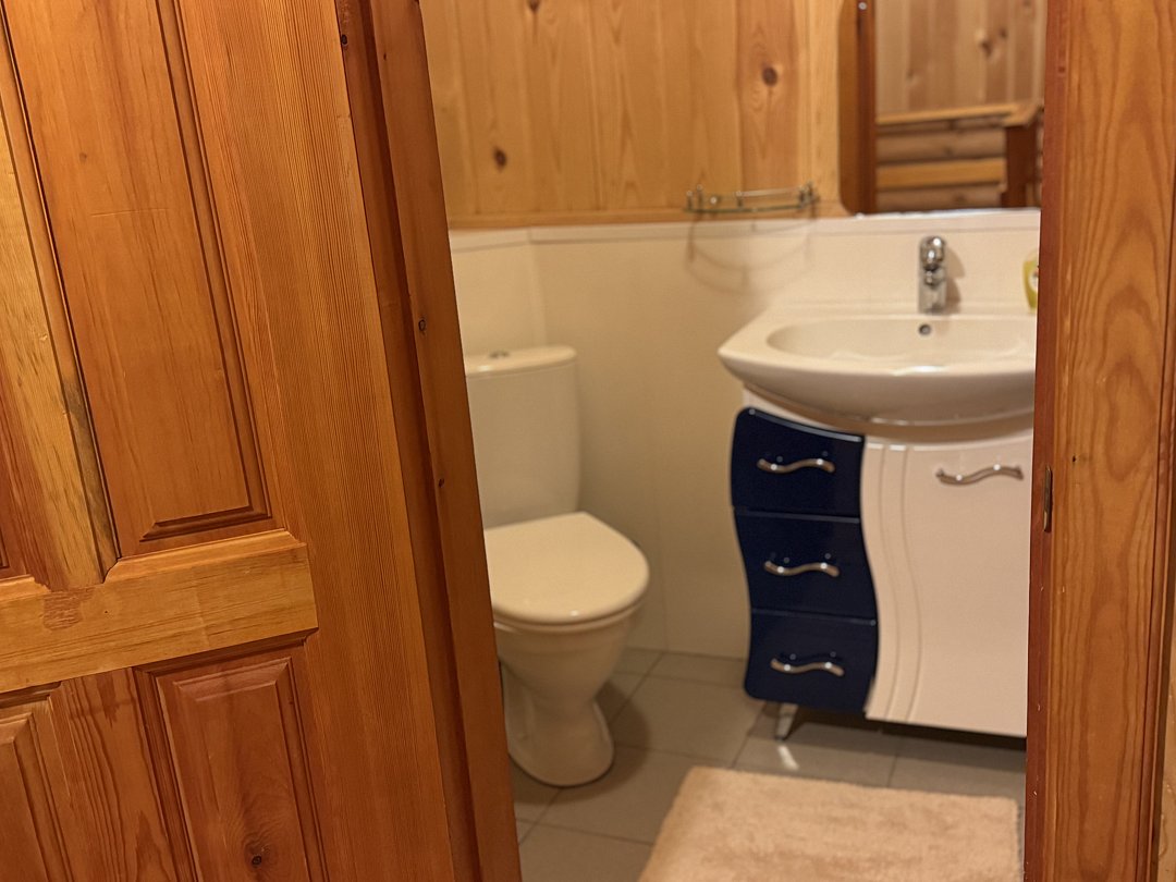 На первом этаже находится компактная, но функциональная кухня, оборудованная всем необходимым: холодильником, электрической плитой, чайником и посудой. Здесь же расположены удобный совмещенный санузел с душем и отдельная туалетная комната.