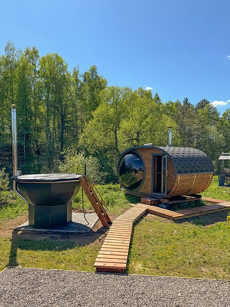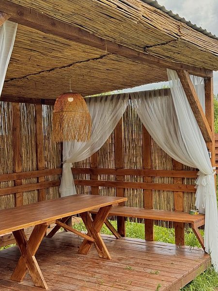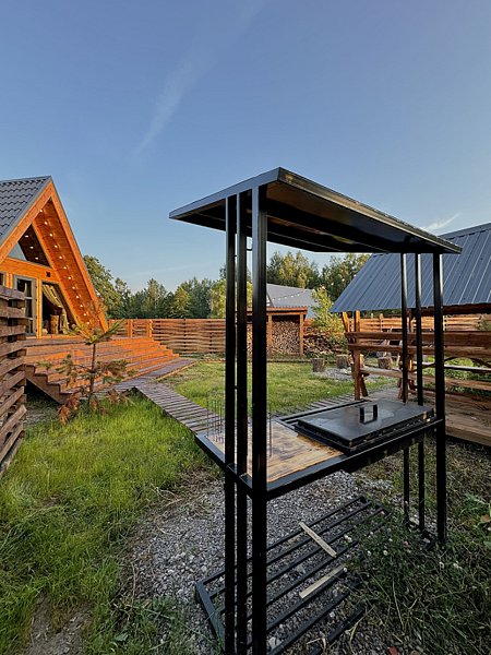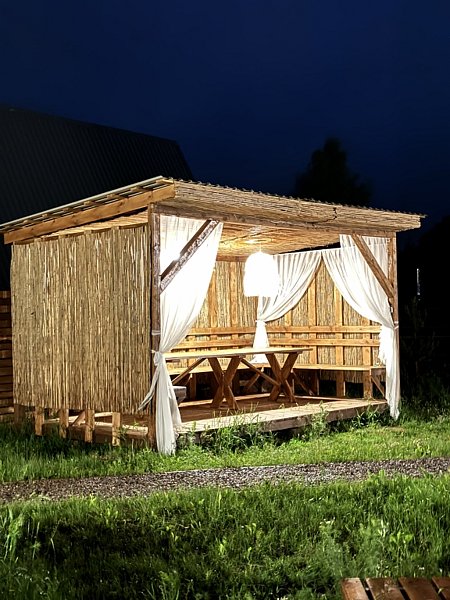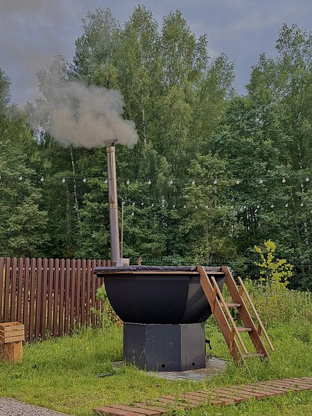 На своей территории каждого домика есть: беседка, костровая зона, мангальная зона с шампурами, решётками, дровами, а также банный чан/купель, а у двух домов есть собственные жаркие бани на дровах.