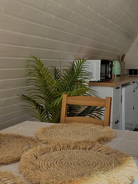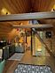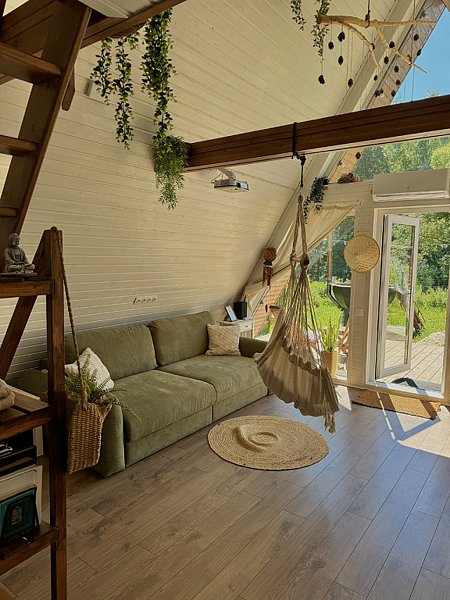 Дом в стиле бохо. Жаркая баня с панорамным сферическим окном и сибирский банный чан рядом с домиком. В доме просторная кухня-гостиная, санузел.