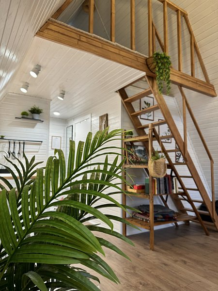 Выполнен в светлых тонах, в южном индонезийском стиле, с множеством предметов интерьера из самого острова Бали. Дом находится на самом берегу реки Воря. Жаркая баня с панорамным сферическим окном и сибирский банный чан рядом с домиком. В доме просторная кухня-гостиная, санузел.