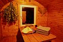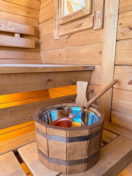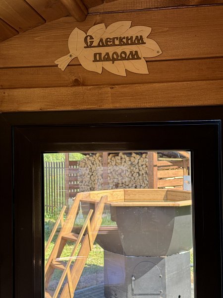 Инфраструктура: тапочки, чан, зона отдыха, полотенца, шапочкиНовая инста-баня со сферическим выпуклым окном: