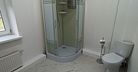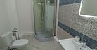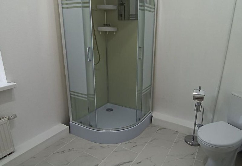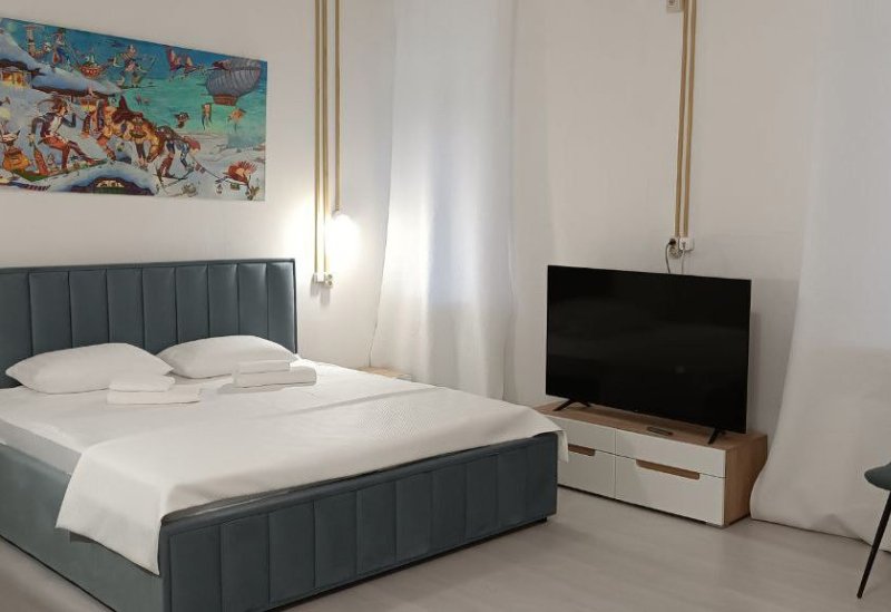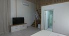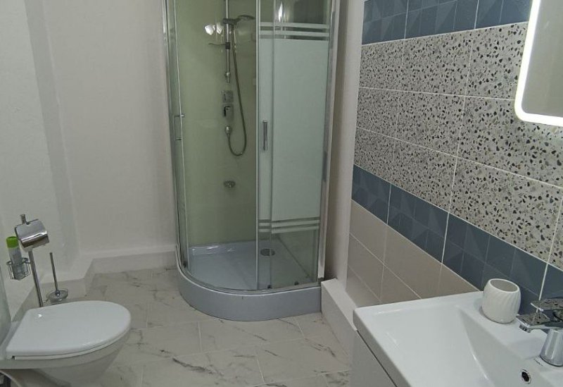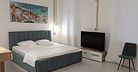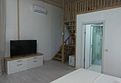 двуспальная кровать, диван, ТВ, холодильник, кондиционер, душевая кабина, туалет, фен. Душевая кабина расположена в спальне, в отдельной нише