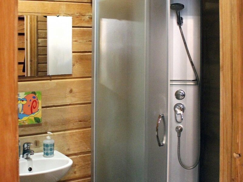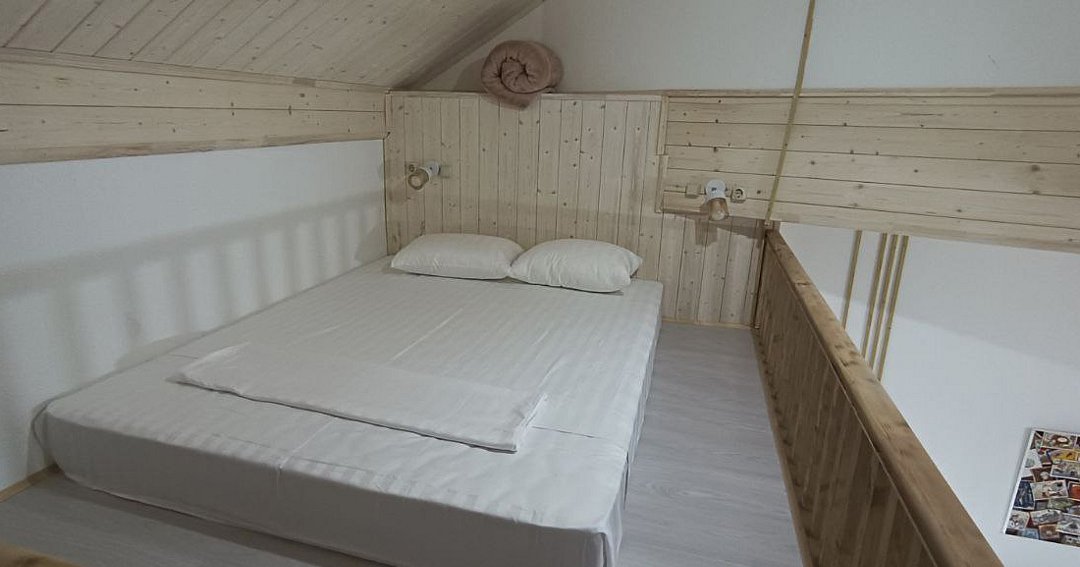 двуспальная кровать, на втором уровне 2-х спальный ортопедический матрас, ТВ, холодильник, душевая кабина, туалет, фен.