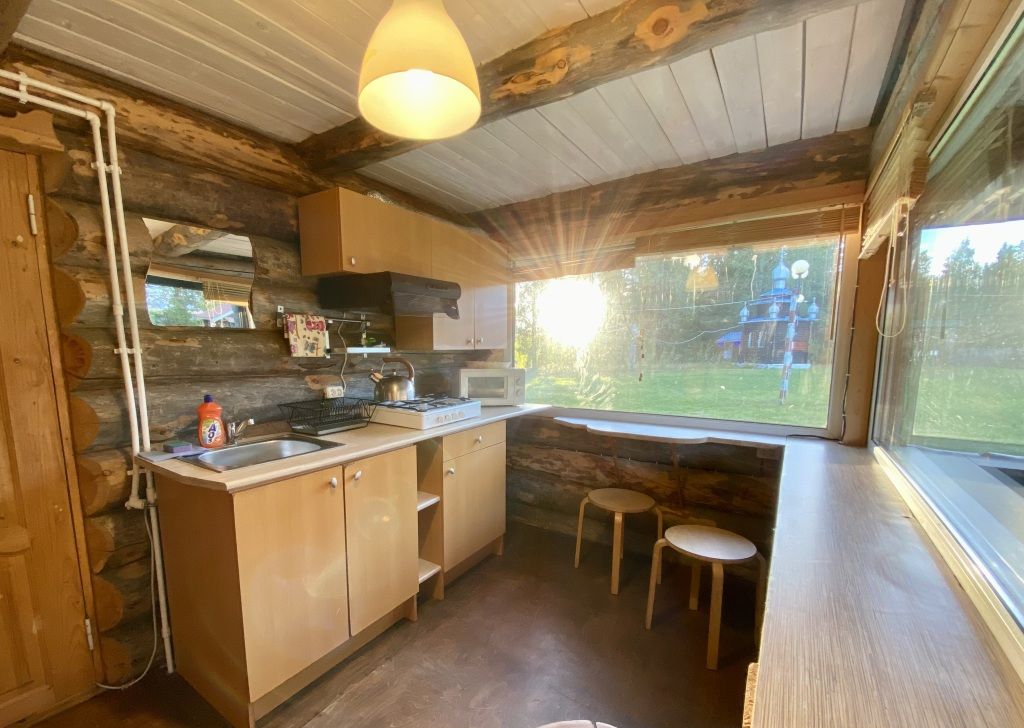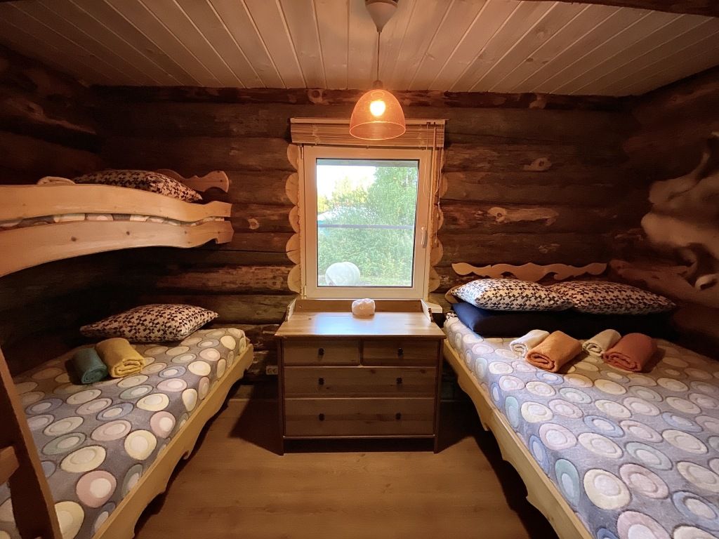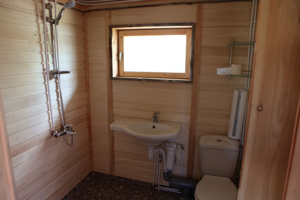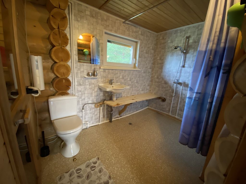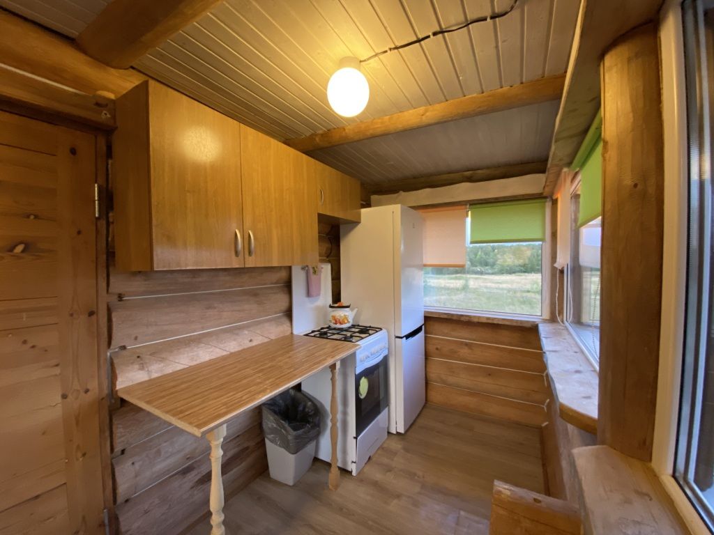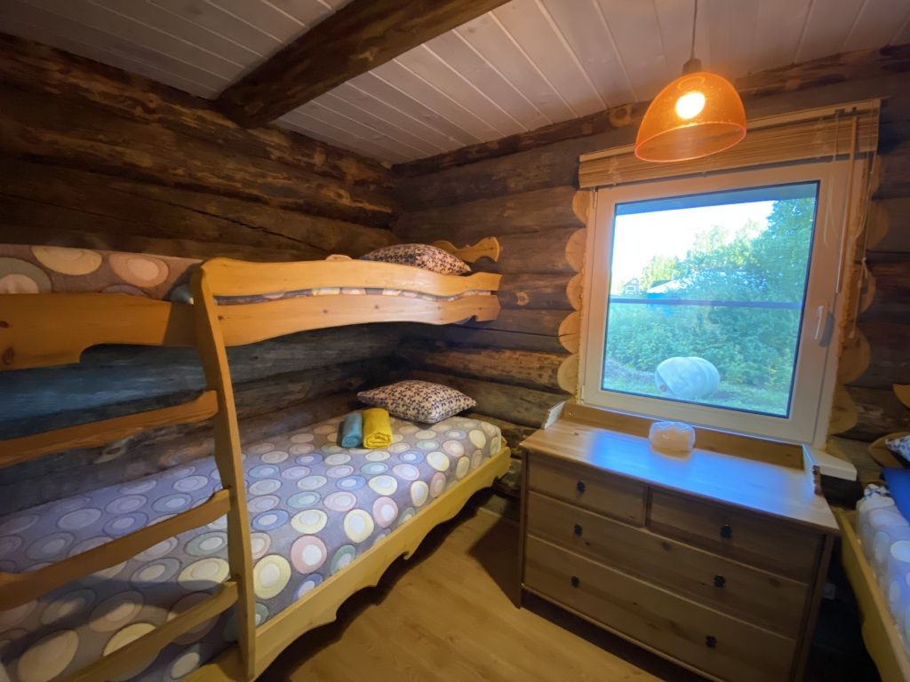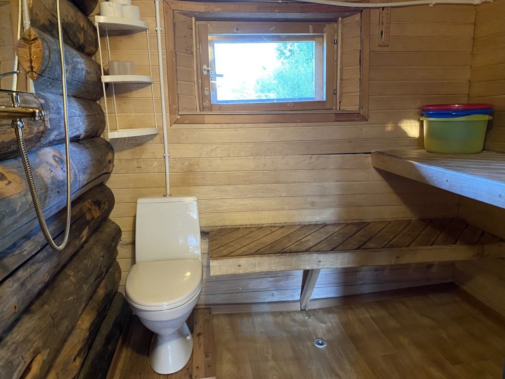 В коттедже есть гостиная, кухня, три спальни, банька дровяная, рядом с домом финский биотуалет.
