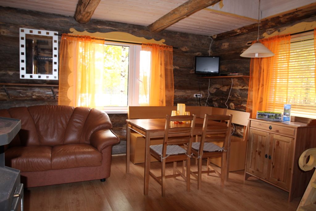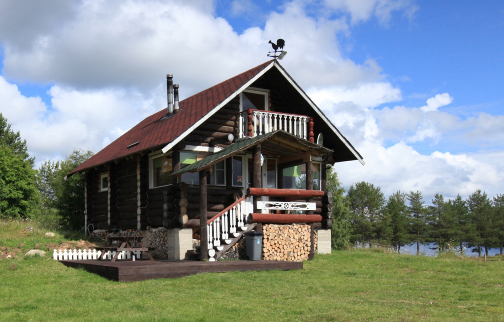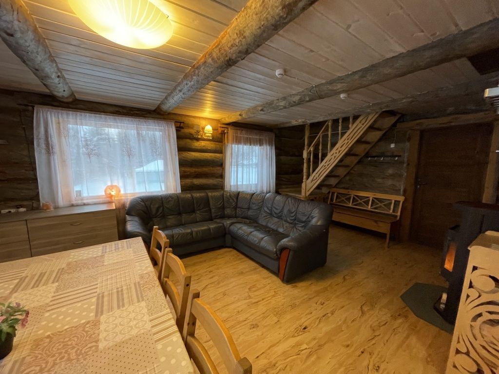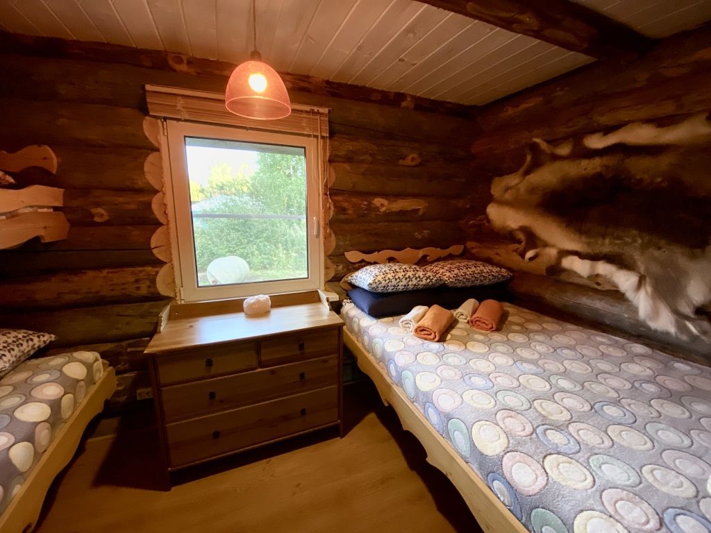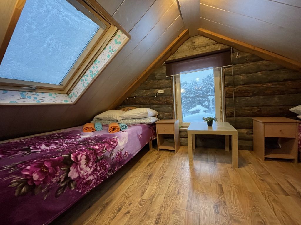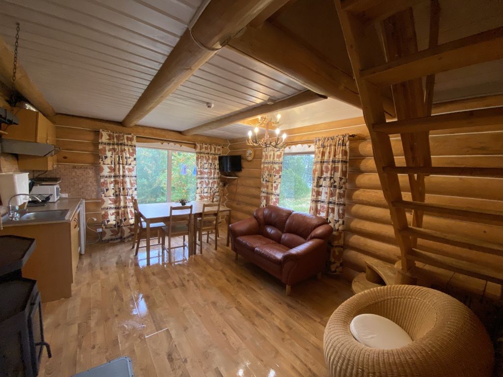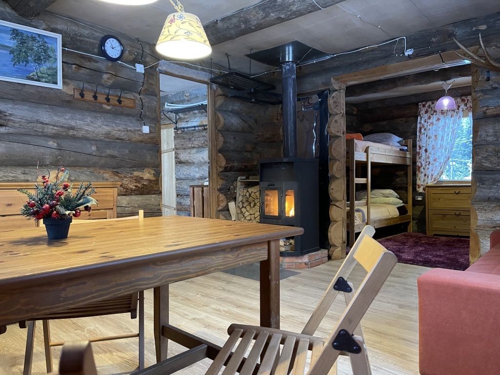 В коттедже есть гостиная, кухня, три спальни, банька дровяная, рядом с домом финский биотуалет.
