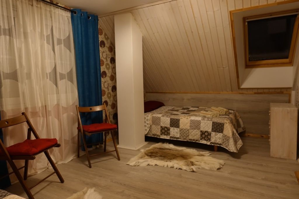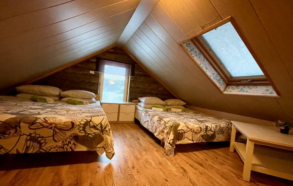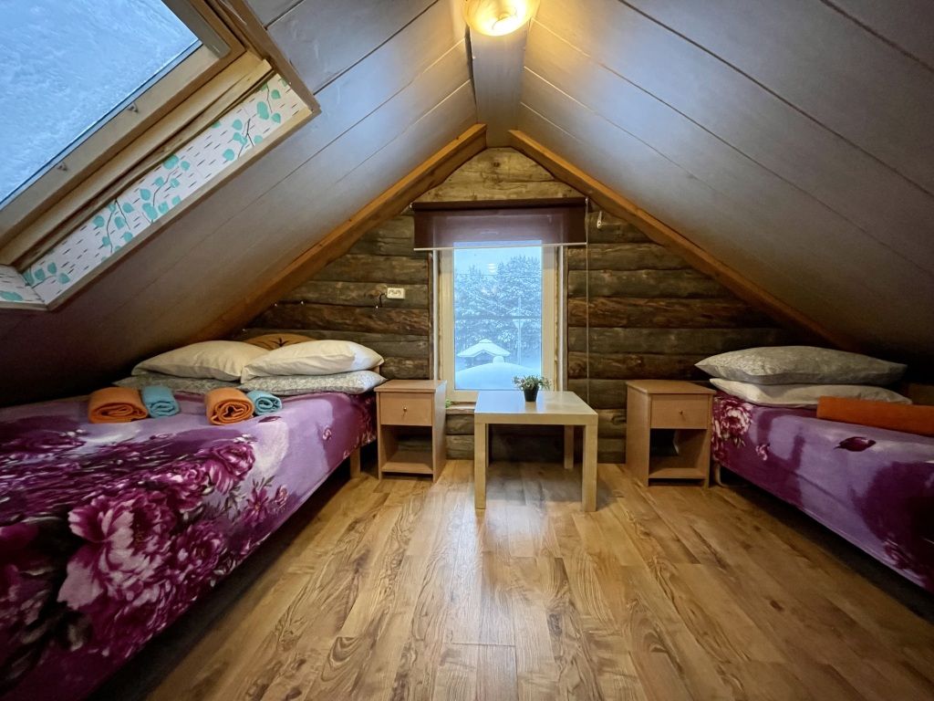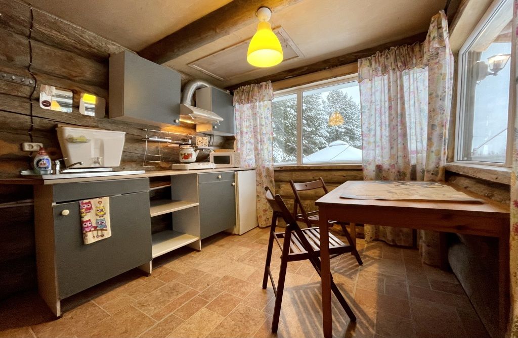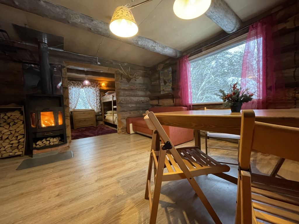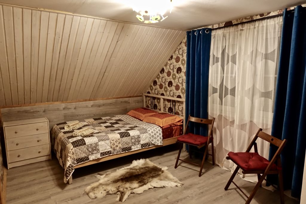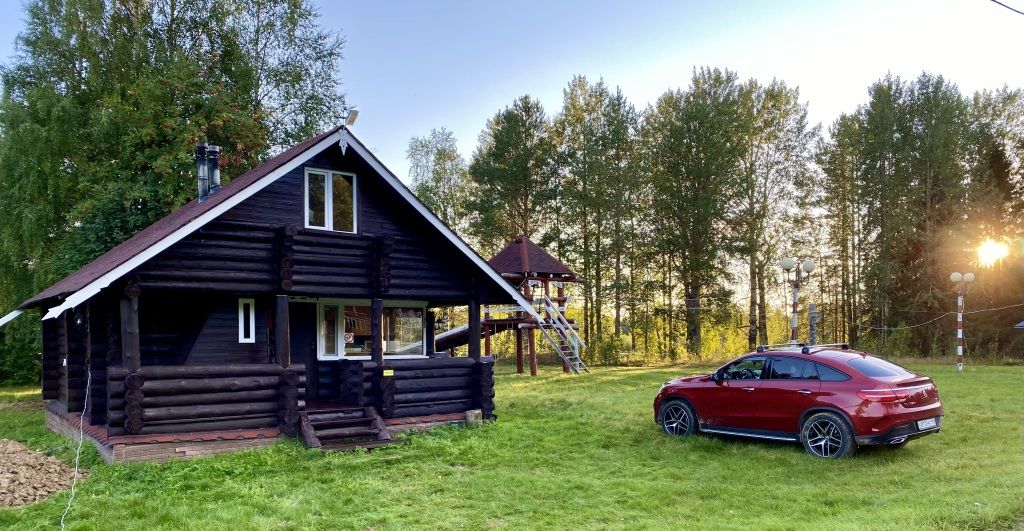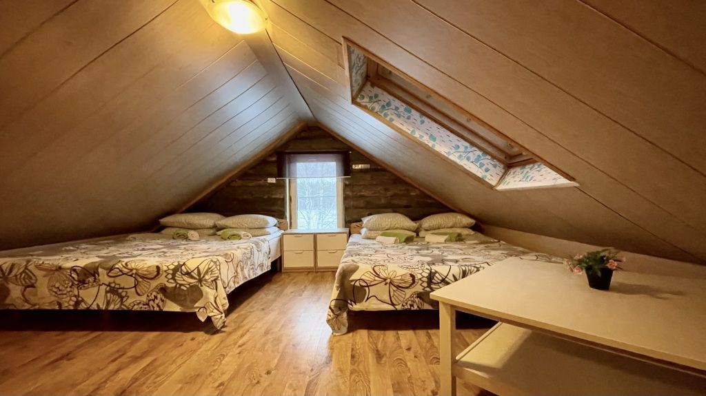 В коттедже есть гостиная, кухня, три спальни, банька дровяная, рядом с домом финский биотуалет.