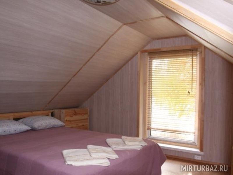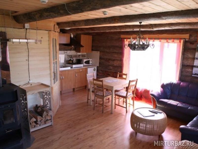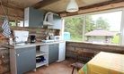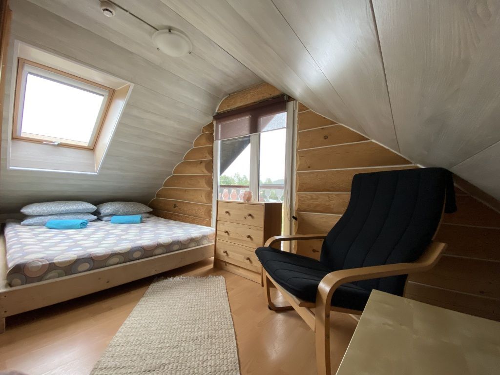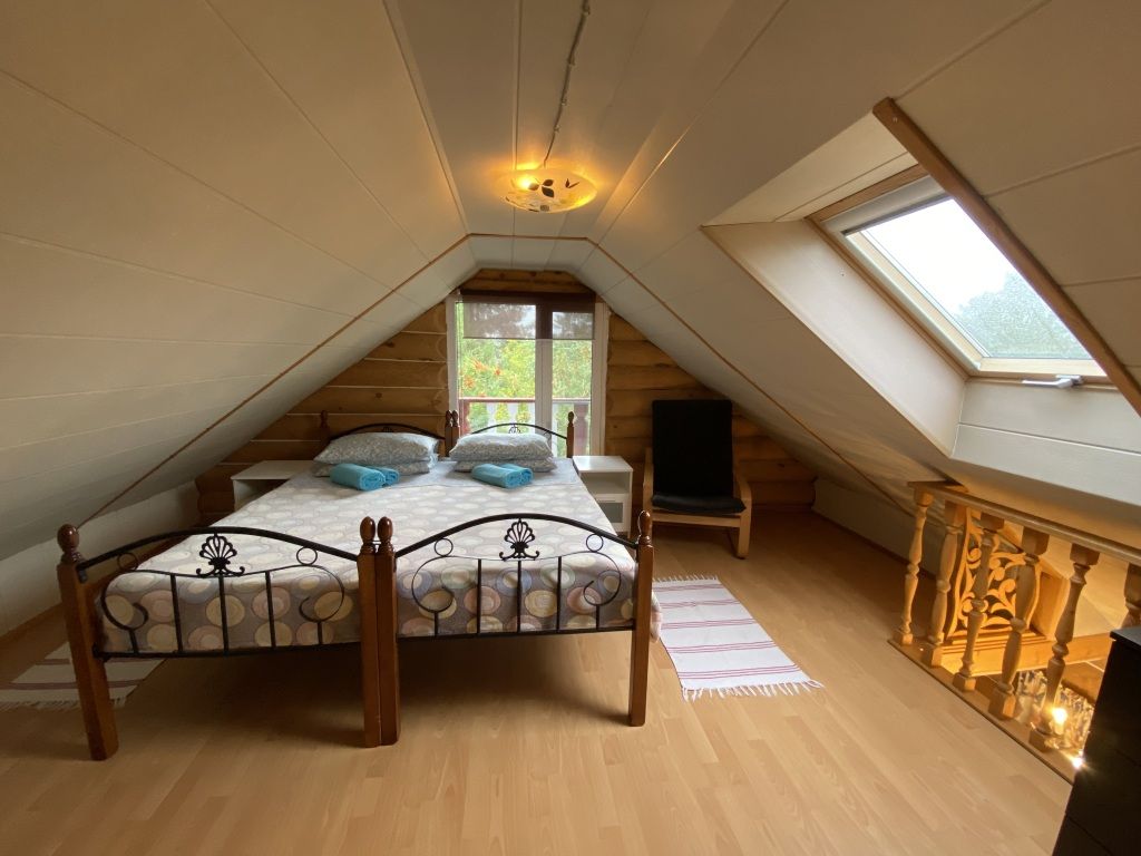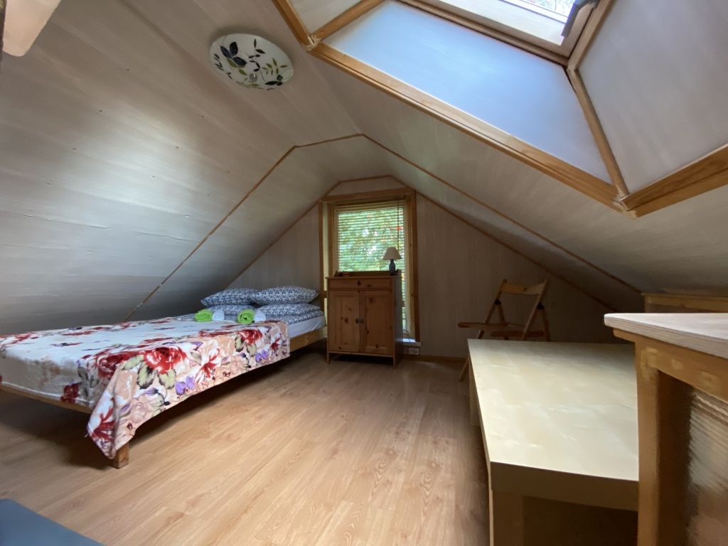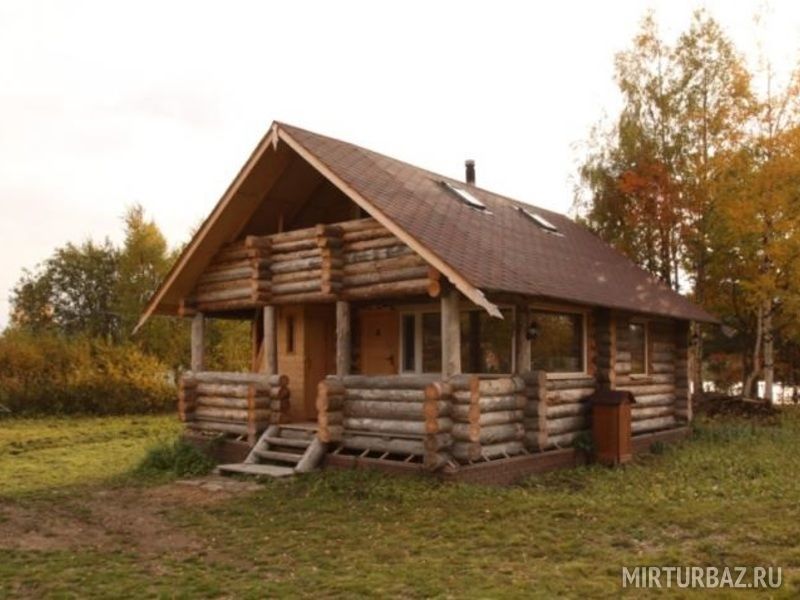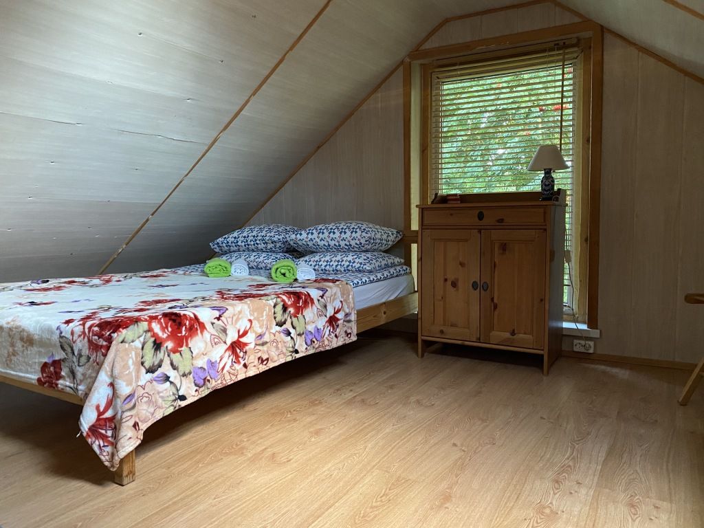 В коттедже есть гостиная с кухней, две спальни на втором этаже, веранда, душ, туалет, банька дровяная.