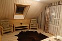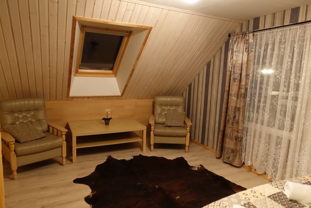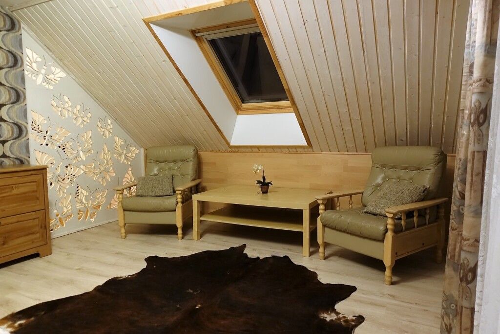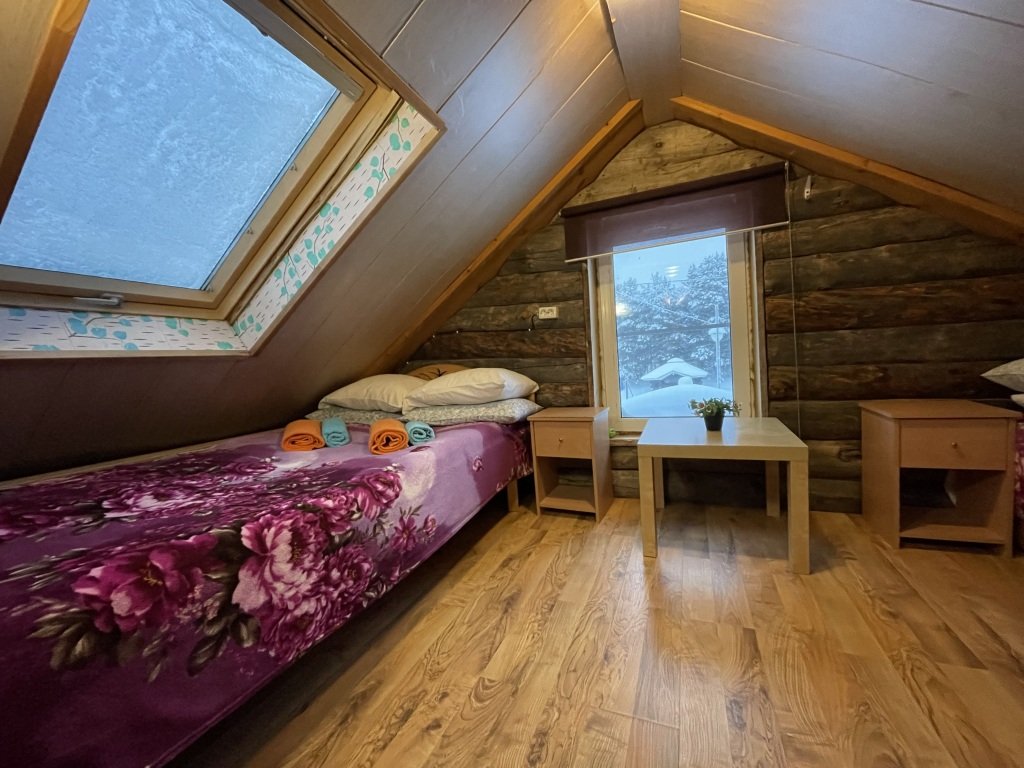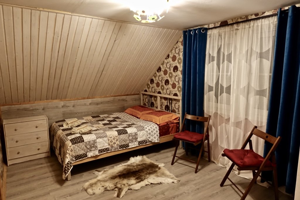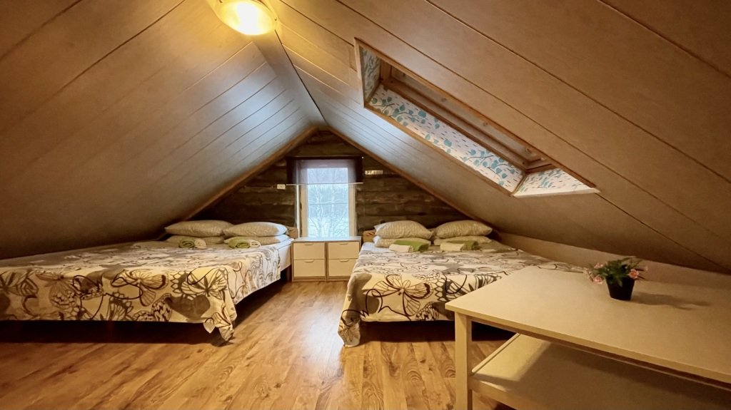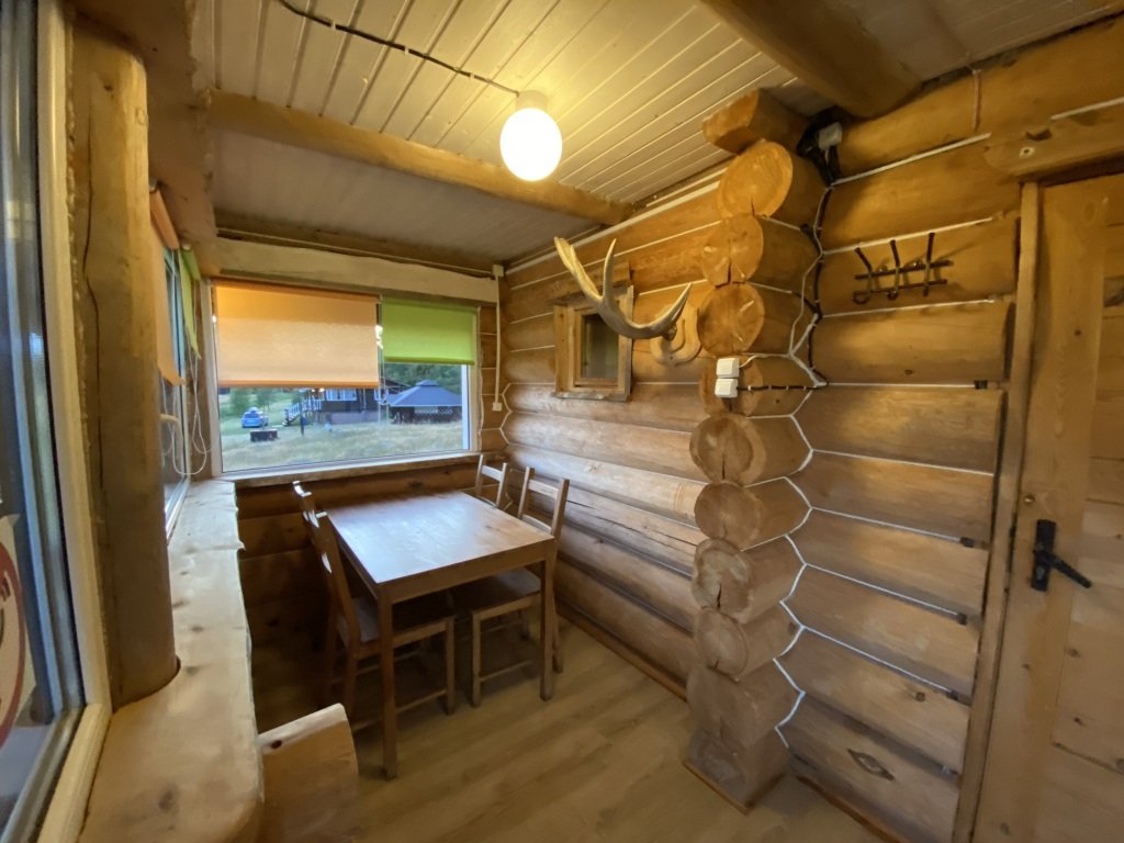 В коттедже есть гостиная с кухней, две спальни на втором этаже, веранда, душ, туалет, банька дровяная.