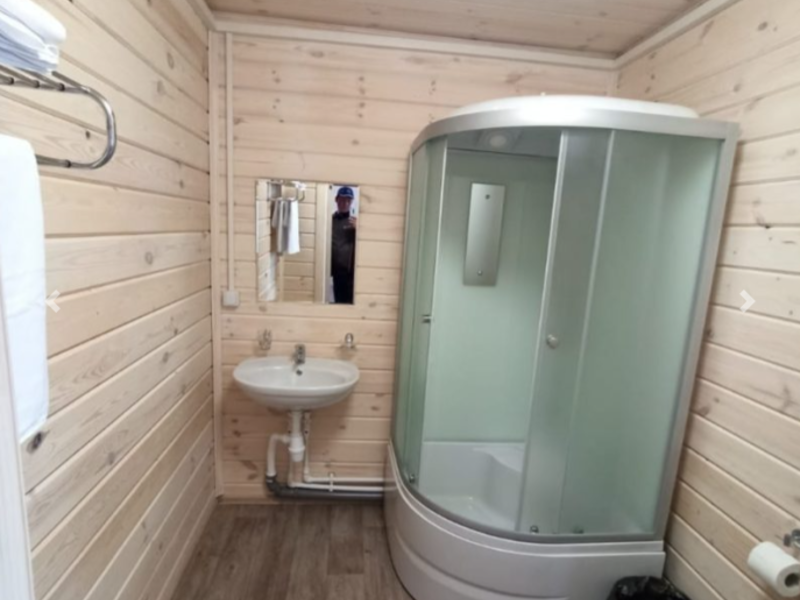 Санузел с душевой кабиной, раковиной, унитазом. Горячее и холодное водоснабжение