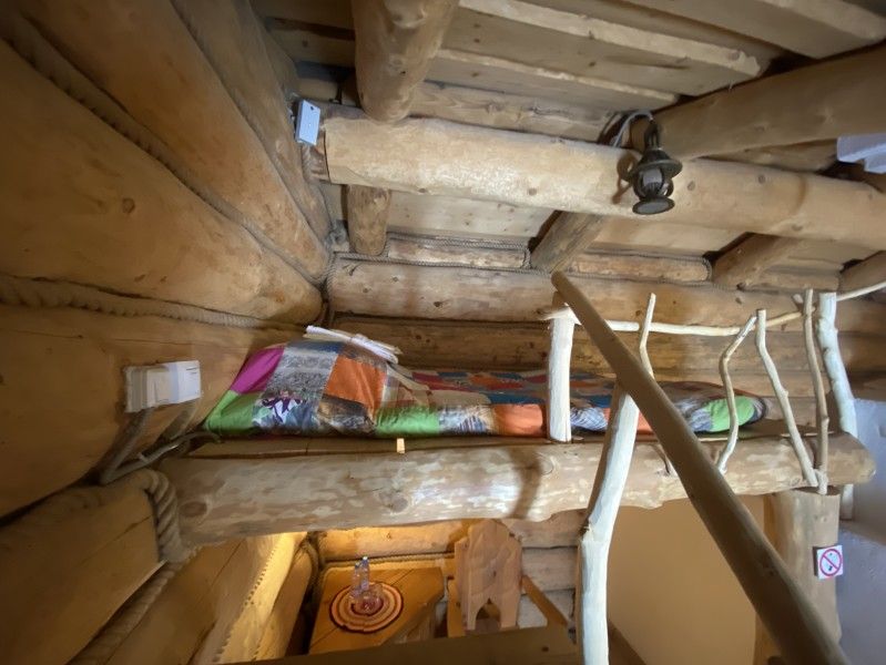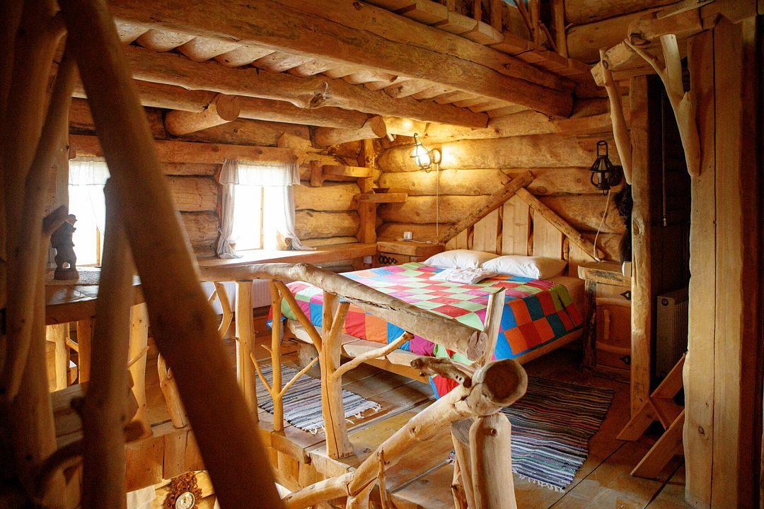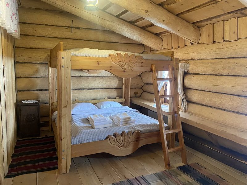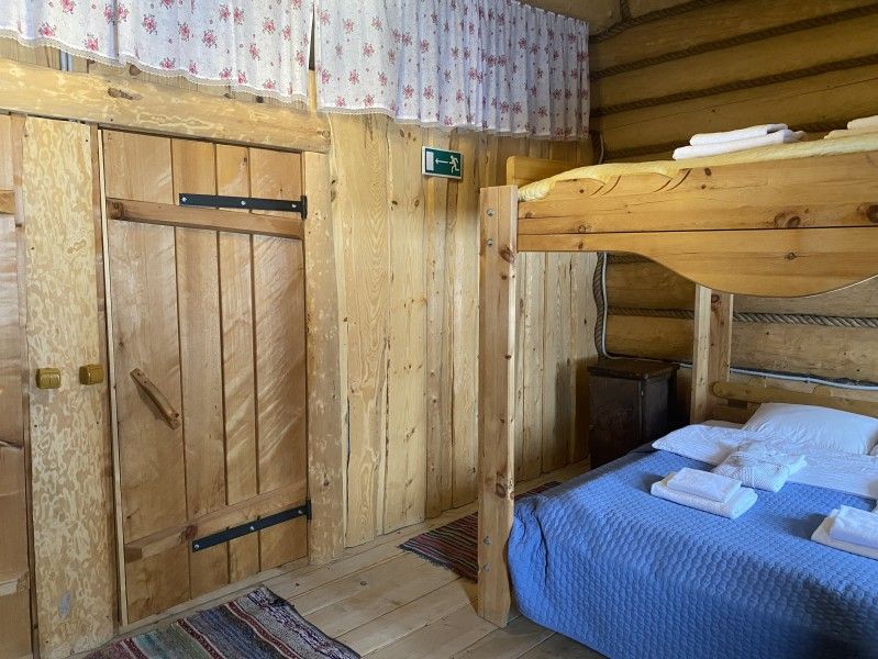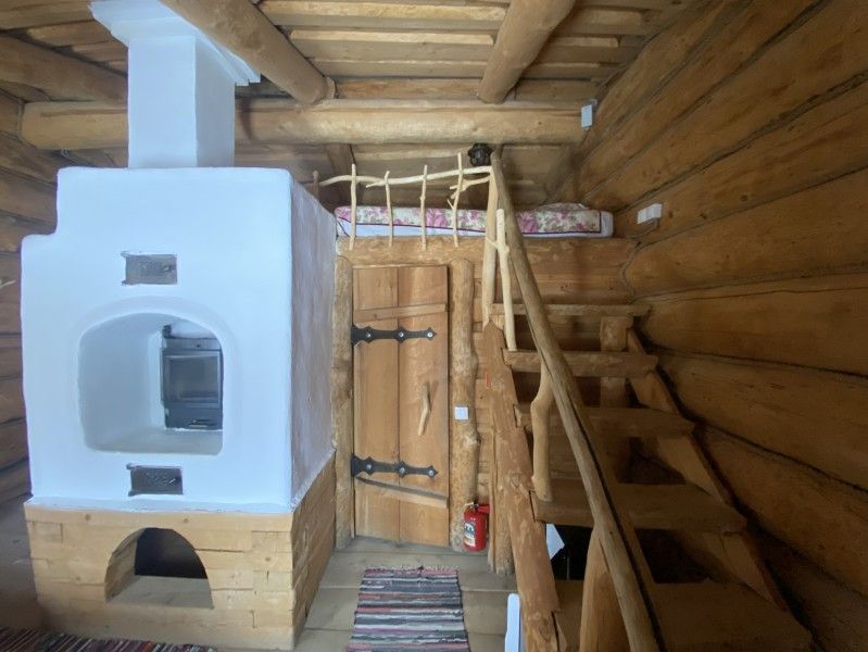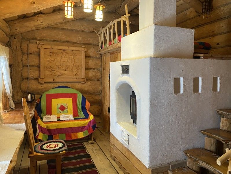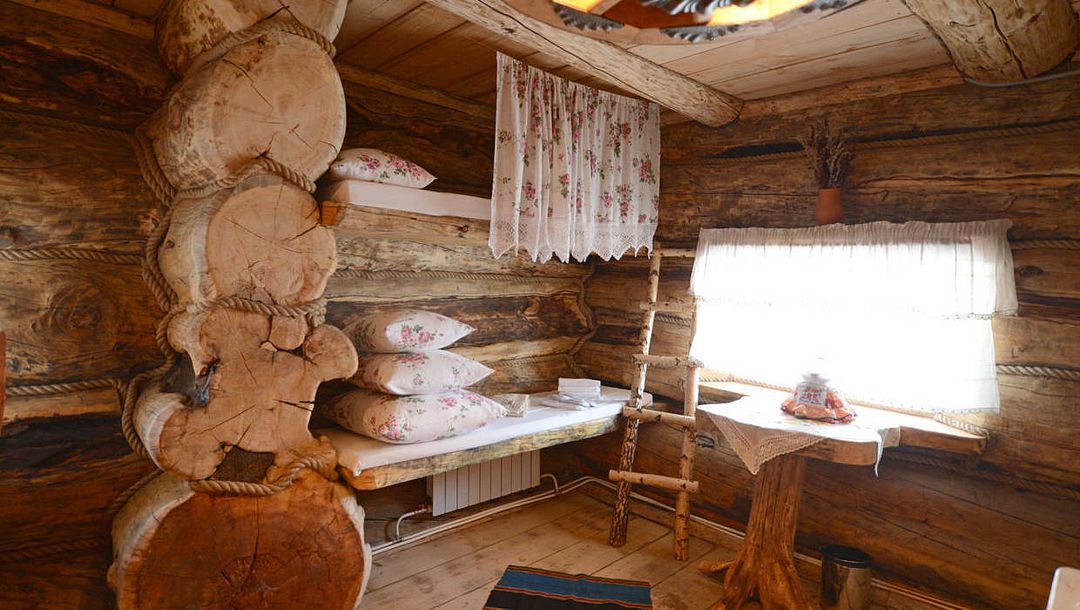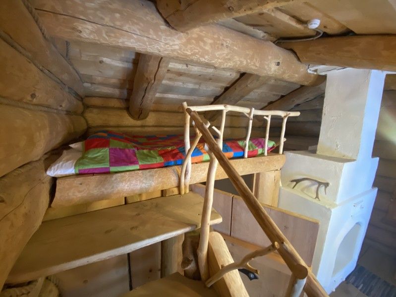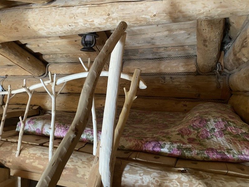 Первое спальное место — полати, матрас на печи; на печь нужно подниматься по небольшой деревянной лестнице; спальное место имеют небольшое ограждение — деревянные перила из веток.