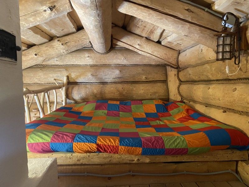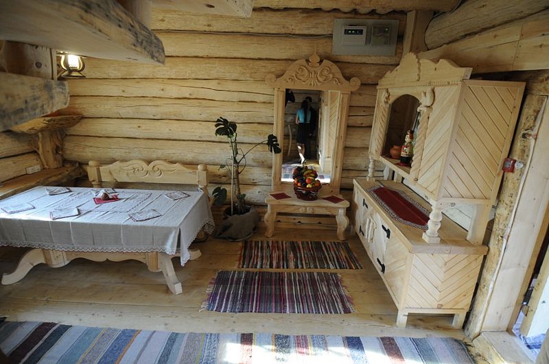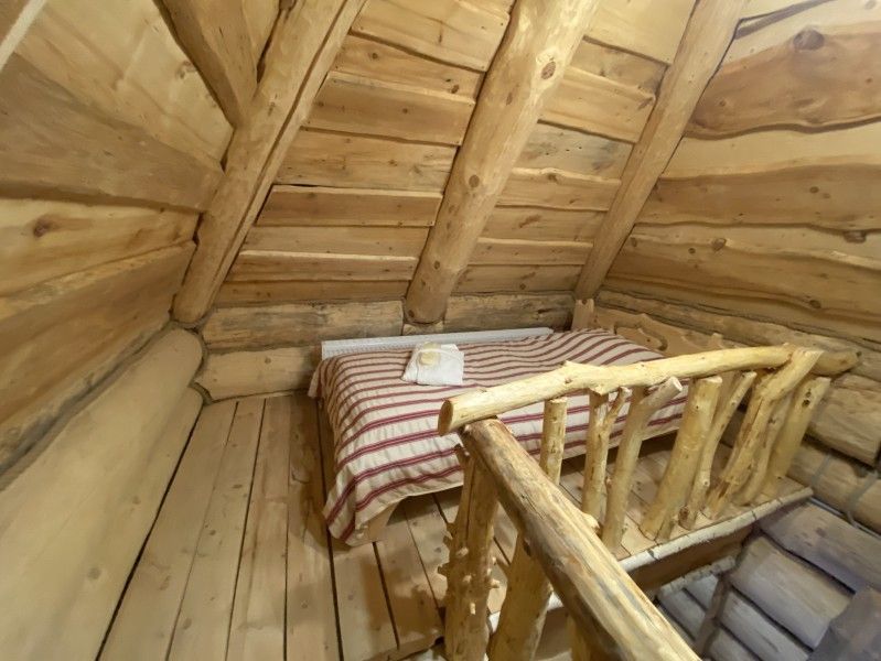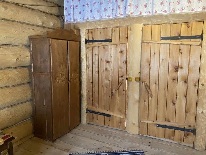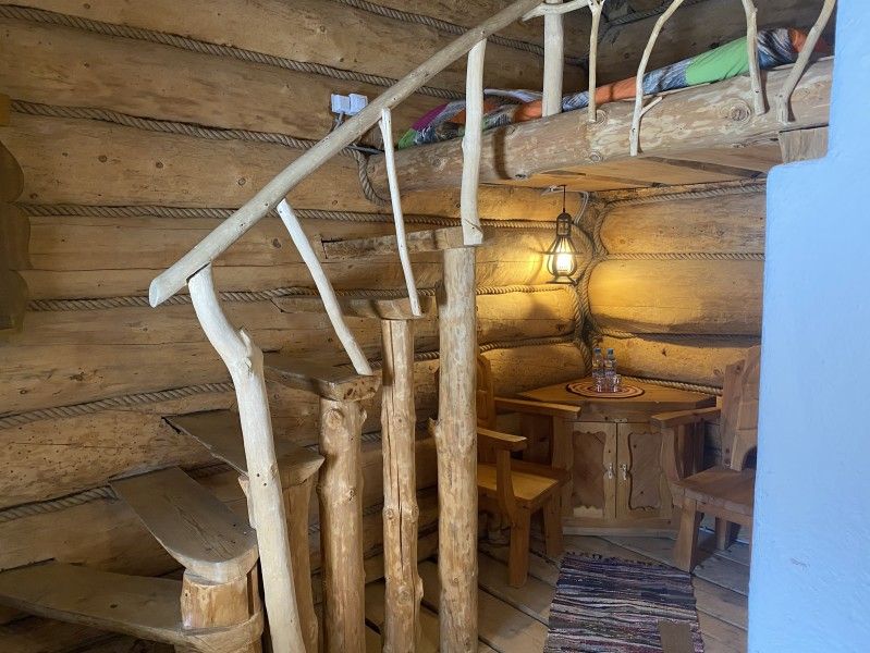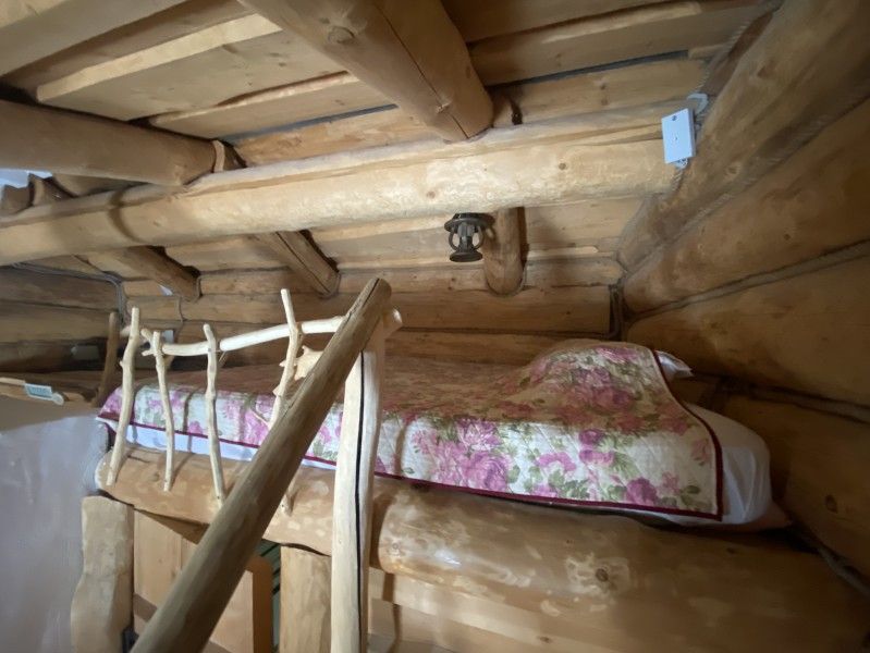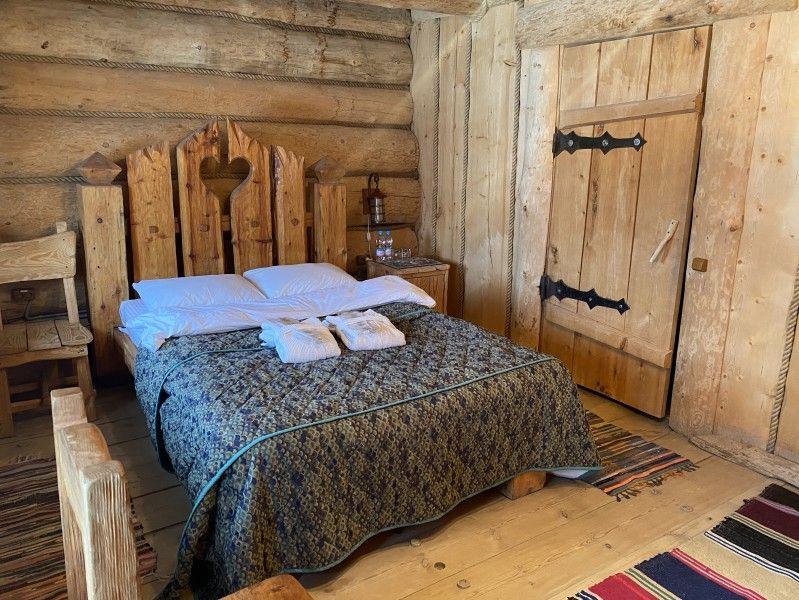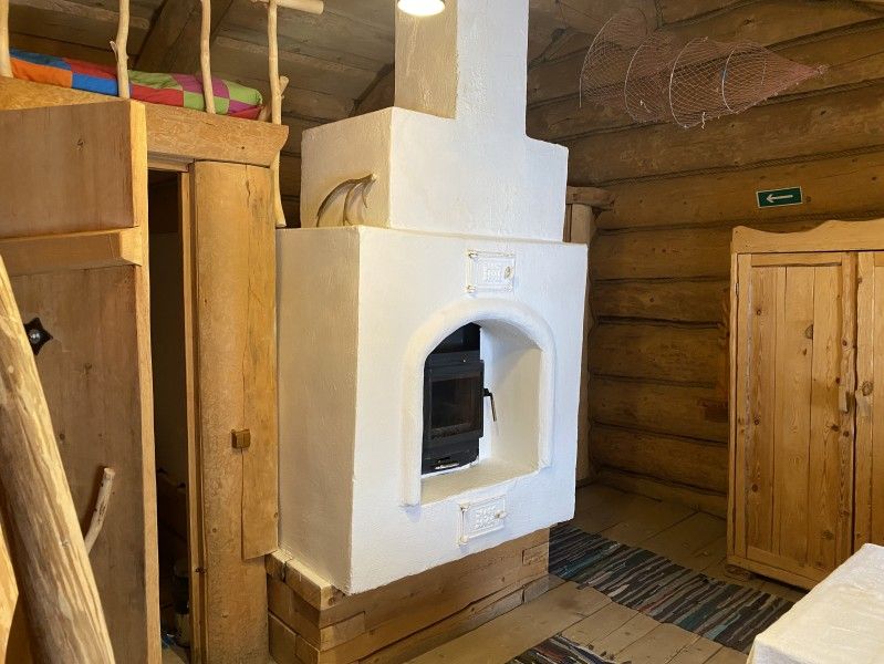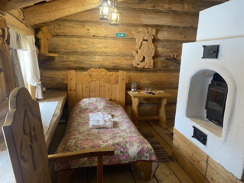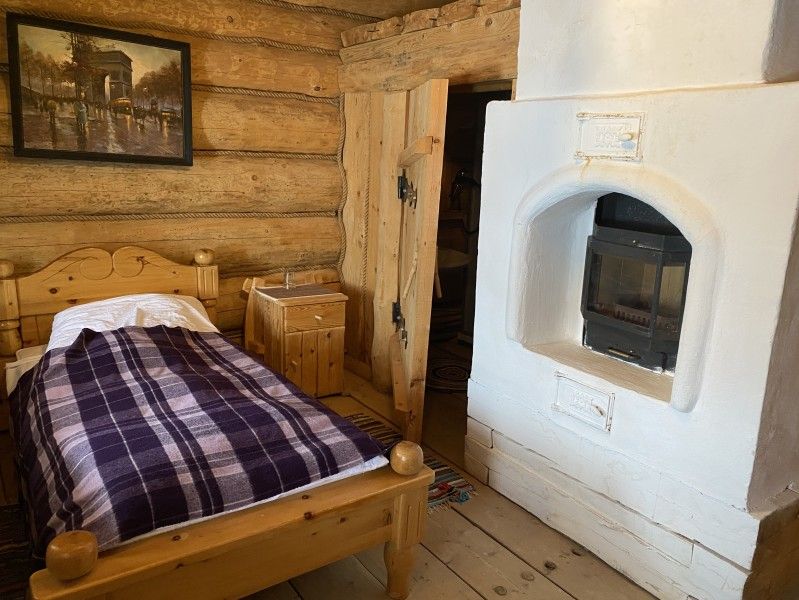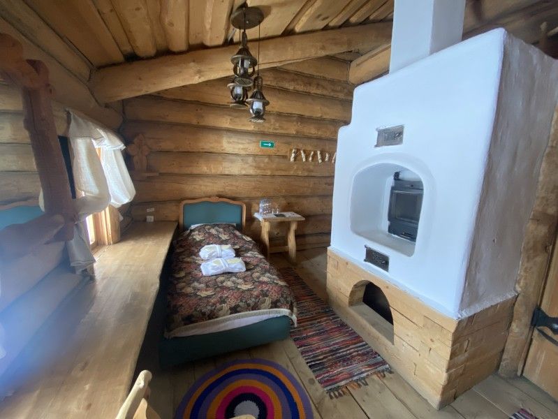 Первое спальное место — полати, матрас на печи; на печь нужно подниматься по небольшой деревянной лестнице; спальное место имеют небольшое ограждение — деревянные перила из веток.