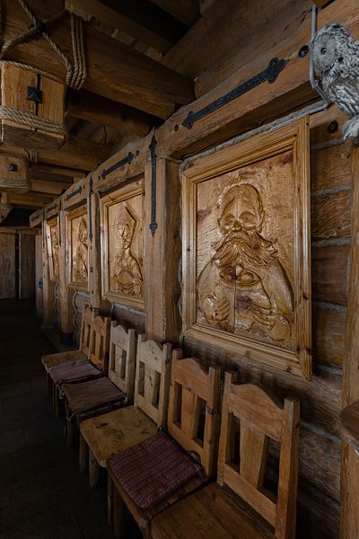 На первом этаже ресторана расположена каминная зона и барная стойка, оформленная в сказочном стиле. Второй этаж предлагает современный зал с потрясающим видом на Иртыш, вмещающий до ста двадцати гостей.