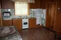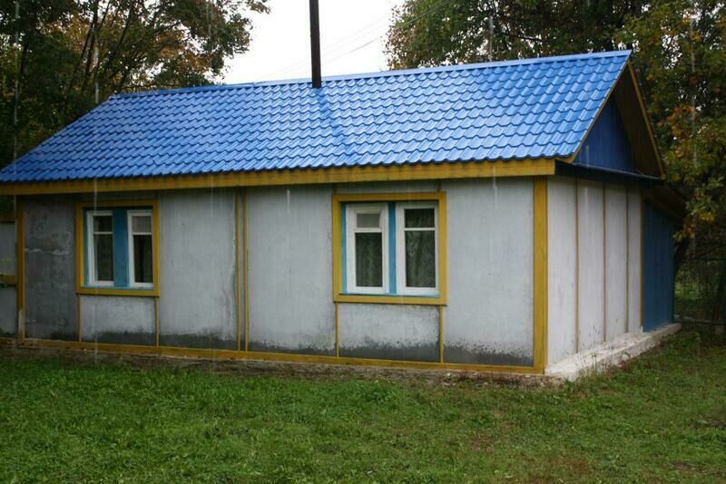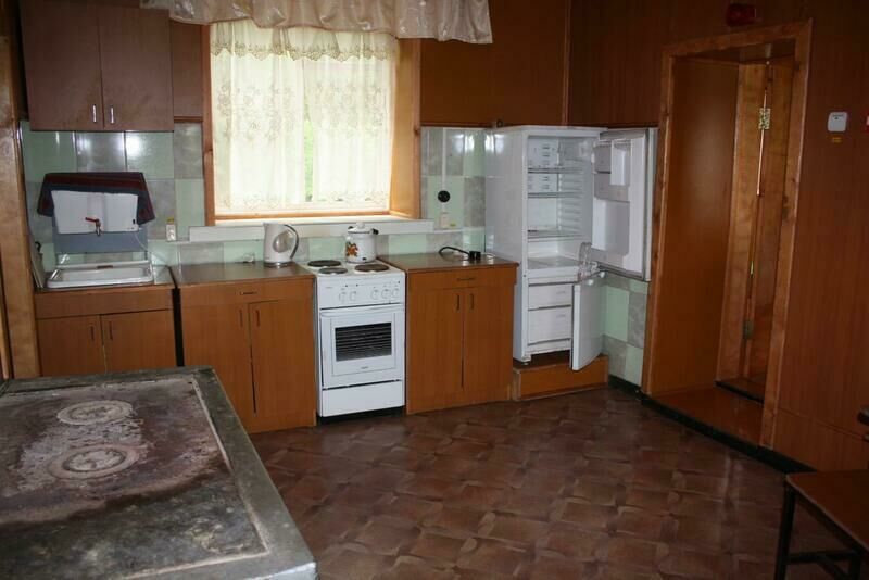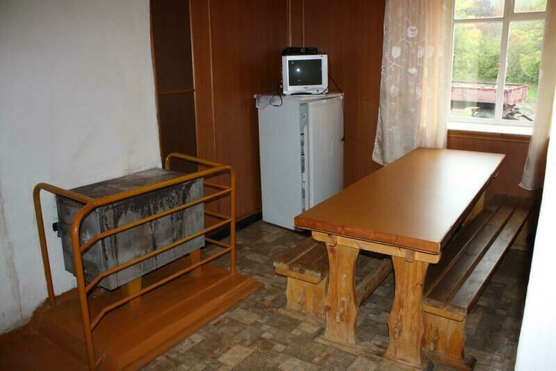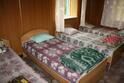 В спальных комнатах 8 односпальных кроватей, на кухне - стол, лавочки,телевизор, холодильник, чайник, кухонные шкафы, посуда, умывальник.