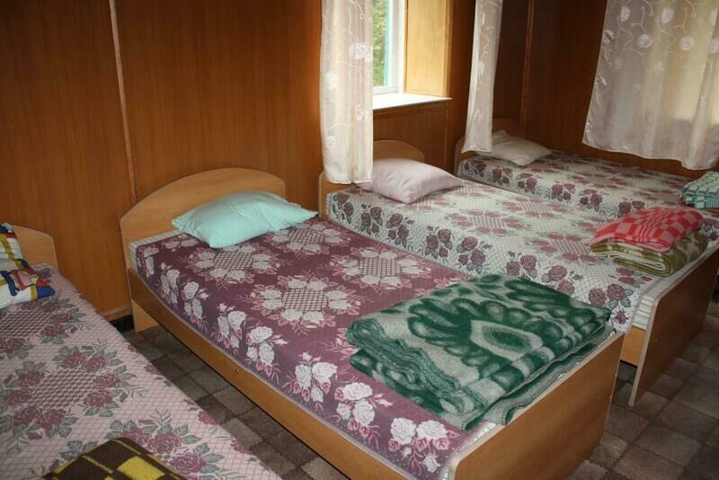 В спальных комнатах 10 односпальных кроватей, на кухне - стол, лавочки,телевизор, холодильник, чайник, кухонные шкафы, посуда, умывальник.