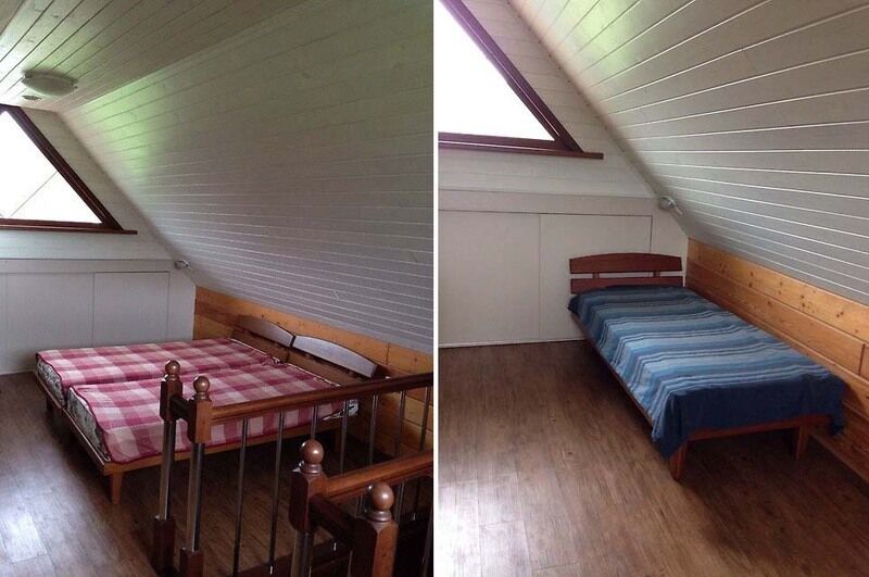 На втором этаже - просторная комната с тремя спальными местами (полуторные кровати,есть возможность разместить 2 дополнительных места - матрасы). Удобства: туалет на улице, в номере вода для чая, умыться, для заезжающих топится деревенская баня.